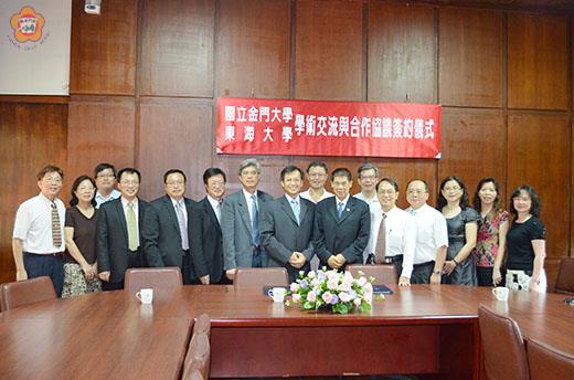 國立金門大學與東海大學兩校加強學術交流,於昨簽署「學術交流與合作協議書」,由金門大學校長李金振與東海大學校長湯銘哲率領雙方代表進行簽署。兩校合作簽署內容包括學生交流、學術及教學合作、行政、圖書與學術資源之交流、研究生訓練、及其他雙方同意的合作方式等項目。 校長李金振表示,東海大學是與金大簽署學生交流協議的第六所國內大學,目前分別已與清華大學、成功大學、體育大學、澎湖科大、台灣師範大學等校簽約,並已陸續有金大學生至前述學校進行交流。未來金門大學將推動與更多國內外著名大學的學生交流或策略聯盟,讓金大同學能夠享有更多元的學習機會。 金大與東海鼓勵兩校學生交流、培養學生跨領域學習。李金振指出,對於昨日簽署的協議書他樂觀其成,未來金大和東海兩校,每年將各自提供十位學生交換的名額,讓兩校的學生有更多的機會走出去看看。他並希望藉此次簽署學術交流協議,能將東海大學的勞作教育精神與博雅教育精神引入金門大學,共同為提升臺灣高等教育努力。