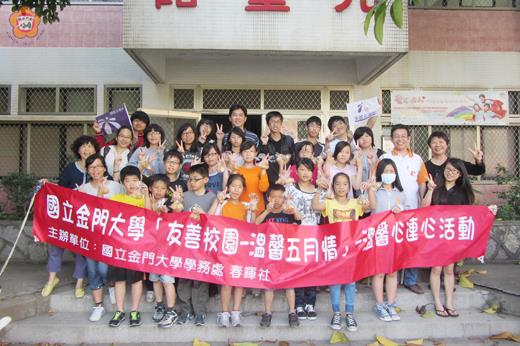 金門大學春暉社日昨赴家扶中心致贈由春暉社同學親手製作的手工餅乾,並將先前校內義賣所得全數捐予家扶中心孩童,展現無私無我、濟弱扶貧的愛心。 金門大學春暉社一行在社團指導老師楊竣華教官的帶領下,於十一日下午四時三十分前往家扶中心致贈手工餅乾及義賣所得,一行受到家扶中心主任林玉真及中心孩童的熱烈歡迎,小朋友拿到大哥哥、大姊姊親手製作餅乾,個個笑得合不攏嘴、舉手稱讚,雙方並在家扶中心館前拍照留念。 春暉社社長陳廷璇表示,該社與食品科學系聯手研製的手工餅乾富含營養,日前在校內系列活動義賣時頗受歡迎,該社決定將義賣所得全數捐助家扶中心,並附上親手製作的手工餅乾一百份,希望藉此鼓勵受扶院童,表達關懷之意。