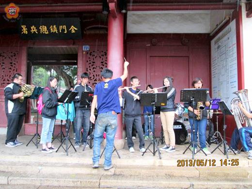 隔海思親情、管樂讚母恩!為慶祝母親節、表達對母親的思念,國立金門大學管樂社昨日下午齊聚在總兵署前進行演奏,希望透過管樂的旋律之美,在母親節裡表達思念親情之意,向遠在台灣的母親說一聲母親節快樂! 金大管樂社成員是在昨天下午二時許,發起這場母親節演奏活動,號召社團成員自動前往金城總兵署廣場集合,並在廣場前奏起動人的音樂、讚頌母恩,貼心的舉動讓許多路過的婆婆媽媽們倍感溫馨。 而昨天下午天空雖然下起濛濛細雨,但仍舊澆不熄該社的熱情,團員連續演奏了「感恩的心、母親您真偉大」等母親節應景歌曲,以及小朋友熟悉的「櫻桃小丸子、馴龍高手」等卡通配樂,讓現場瀰漫著溫馨歡樂的母親節氣氛。 據了解,金大管樂社的社員大多都來自台灣各地,離鄉背井在外地求學,每逢佳節更顯思念之情,為表達對母親的感謝,希望用音符傳遞對母親的思念及感恩,更希望可以分享音樂的感動給所有民眾及在外地的遊子。 金大管樂社也表示,昨天舉行的母親節音樂會係為五月三十一日晚上七時三十分舉辦「經典狂響;感動再臨」演奏會暖身,五月三十一日當天,金大管樂社將透過電影戲劇、動畫民歌等經典樂曲的詮釋,讓大家更貼近音樂、與管樂同樂同悅。