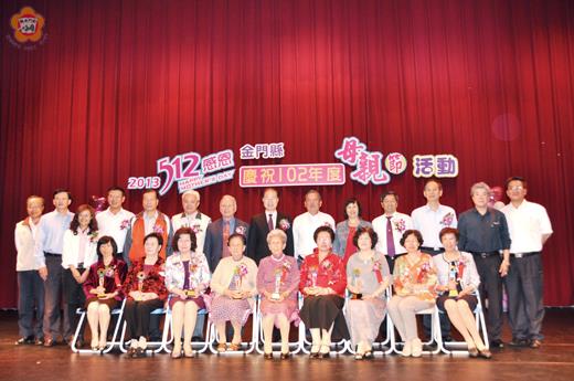 慶祝102年度母親節,金門縣政府昨日上午在社會福利館隆重舉行母親節表揚活動,縣長李沃士、議長王再生頒獎表揚各鄉鎮廿五位模範母親,並與獲獎者及親屬一同觀賞精采表演及切蛋糕共祝「母親節快樂」!李縣長以「樹欲靜風不止、子欲養親不待」,提醒鄉親以家庭為核心,以媽媽為中心,大家一起來善盡為人子女的孝道。 金門縣政府辦理模範母親表揚暨慶祝活動於昨日上午十時起假社會福利館演藝廳舉行,由全音山葉音樂教室劉洋彈奏鋼琴配樂、翁綺霙詩歌朗誦「母親真偉大」揭開序幕,由縣長李沃士、議長王再生頒獎表揚全縣二十五位模範母親,縣議會議員唐麗輝、陳滄江,縣府社會處處長方天吉、環保局長楊世宏,金城鎮民代表會主席陳天成、金湖鎮鎮長蔡西湖、金沙鎮鎮長陳昆第、金寧鄉鄉長陳成勇、金城鎮公所主任秘書黃耿銘、烈嶼鄉公所秘書方小萍以及各鄉鎮社會課長和家屬齊聚一堂觀禮,分享媽媽得獎的喜悅。獲獎者家屬成群登台獻花傳情,讓媽媽們笑開懷,高興之情溢於言表。 昨日由縣長李沃士、議長王再生頒獎表揚獲獎的模範母親,她們分別是:金城鎮│王輝輝、黃素資、陳寶珠、楊寶雪、李秀鸞、辛娜、李美幼、蔡彩蓮、李金蓮。金湖鎮│陳李翠和、李秋良、周金樓、盧波、蘇春子。金沙鎮│蔡美珠、蔡翠雪、何玉含、陳秀蓮。金寧鄉│董玉蘭、戴連治、李浯燕、陳淑愛。烈嶼鄉│洪固治、陳林箱、洪妹治,共計廿五位模範。 母親節快樂!李沃士表示很高興參與102年母親節表揚活動,首先對獲獎模範母親表達最崇高敬意。李沃士指出,「母愛」的偉大,比太陽還溫馨,在為人子女眼中母親都是最偉大,除對所有母親表達祝賀外,也期許媽媽們要注意自己的身體,健康做的好,家庭才會和樂幸福,希望媽媽們多運動,保健康,都能健康呷百二。 他指出,母親是家庭中最核心位置,家庭能穩定成長,家庭能幸福和諧安康,就是社會穩定的力量,每個家庭都幸福和諧國家就會富裕強大。母親對孩子的愛,無私的付出及對家庭的貢獻,非筆墨所能形容,俗話常說「樹欲靜風不止、子欲養親不待」,提醒鄉親平常要能及時盡孝道,為人子女要做好家庭倫理,作為下代子女的典範。他說,家有一老、如有一寶,家中寶貝照顧好是我們修得的福份,期待我們以家庭為核心,以媽媽為中心,大家一起來善盡為人子女的孝道。 王再生、蔡西湖上台致詞指出,媽媽在家裡扮演十分重要的角色,每一位媽媽都十分偉大,她不離不棄,充分發揮母愛精神令人尊敬,「手抱嬰兒、方知父母心」來勉勵大家,也籲請為人子女行孝須及時。不管為人子女在外求學或工作,記得常打電話報平安、向父母請安,或簡單的一句「阿母,吃飽沒!」母親也會備感窩心,最後,祝福全天下所有母親,永遠健康快樂。 而頒獎典禮中也安排由邱驛棠所指導、金門棠風舞蹈團成員擔綱演出的「可愛的貓」、四埔社區發展協會演出「走天涯」,議員唐麗輝指導,金沙土風舞社演出「南泥灣」,金門縣手語協會表演「心肝寶貝」,中堡蔡遠進演出木偶戲,精彩演出也博得熱烈掌聲。
