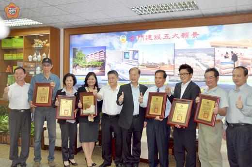 101年度績優特產廠商名單出爐,縣長李沃士昨日親自頒發獎牌表揚金酒公司等六家業者,除感謝企業、廠商朝優質發展的帶動觀光旅遊助益,和創造就業機會的用心,並允諾對於績優特產廠商產品,以績優禮盒共同包裝,來統一採購以做為贈禮推銷,並在全國商展或相關推介會予優先參加,給予實質鼓勵。 金門縣政府辦理101年度績優特產廠商評選,是有三十五家業者納入評比,並評選出金酒公司、金合利鋼刀、王大夫一條根、良金實業、聖祖貢糖、大方麵線等六家業者為績優特產廠商。 縣府昨日下午二時三十分,並由縣長李沃士親自頒獎表揚,俾作為企業之標竿。在場觀禮的有建設處副處長楊文璽、科長呂基鴻、金門縣工商發展投資策進會總幹事蕭永平、金門縣商業會常務監事陳松泉等人。金酒公司董事長李文選及得獎特產廠商負責人或代表出席領獎。 李縣長除向得獎績優特產廠商表達恭喜,並對地區發展觀光過程中,特產廠商與地方政府合作,是很重要支持一環。強調民間企業優質發展,絕對是地方進步的中堅力量。並以近兩三年來,很高興企業投資金門,讓金門經濟發展有更顯著成效,也祝福績優特產廠商更拓展市場。 縣商業會常務監事陳松泉也以縣府對提升地方產業的用心,表達肯定同時,強調該會未來將做更新企劃案,以在縣府支持和業者共同努力,來帶動金門產業發展。並建議縣府將績優特產廠商印在宣傳摺頁,協助業者推介行銷。