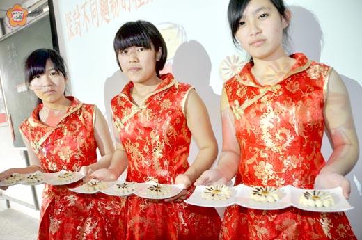 全國十二強! 金門農工餐管科學生劉家昀(右)、林子倩(中)、蔡亞庭(左)參加全國高職學生102年度專題製作競賽,已進入十二強,今天(五月十一日)將在決賽中繼續爭取好成績。他們參賽的專題為《探討不同麵粉的種類對菊花酥點心的影響》。 今年的全國高職學生102年度專題製作競賽是由國立臺灣科技大學「職業學校群科課程推動工作圈」主辦,共有一百六十五個隊伍參加。