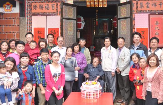 十秩晉一,百祝千秋!東村老人呂水港的歲數昨天更上一階,到達人生的「一零一」。中國國民黨主席馬英九以「百祝千秋」壽屏為賀。 上過私塾的呂水港,一直有閱讀《金門日報》的習慣,昨天,小他九十歲的外曾孫女蔣欣彤不但為他彈了〈生日快樂歌〉,還用閩南語讀報給他聽。 呂水港的子孫三代共有七十五人;昨天是民國一百零二年五月五日、農曆則是蛇年三月二十六立夏日,長子呂永成、次子呂永財兄弟帶領著家小為他慶祝一百零一歲生日。 金門縣長李沃士、金門榮民服務處處長鄭有諒、金門防衛指揮部政戰副主任李清俊、中國國民黨金門縣黨部組長陳志強、金湖鎮黨部主任陳汶強昨天都前往賀壽。 呂水港生日這天,年僅十一歲的外曾孫女蔣欣彤,還有年僅兩歲半,相差只有五十天的曾內孫呂奕潼、呂晟宏堂姐弟,都隨著父母回到祖宅來替阿祖過壽。 目前就讀吉人國小的蔣欣彤用可以彈出音階的鍵盤式玩具琴彈出生日快樂歌給阿祖聽,還用阿祖的母語唸《金門日報》的標題給阿祖聽;她祝福阿祖再過更多的生日。 呂水港在金門經歷過日軍統治、古寧頭戰役、八二三砲戰等戰役。他幾乎與中華民國同齡,經歷過國家最苦難的日子。金門縣長李沃士認為老人家的歲數登上了一零一,實在很不簡單!他祝福老人家繼續健健康康「呷百二」! 金防部指揮官潘家宇、金門榮服處處長鄭有諒、國民黨金門縣黨部主委林芳旋贈給壽星的壽屏分別為:「松柏長青」、「福壽康寧」、「壽比南山」。