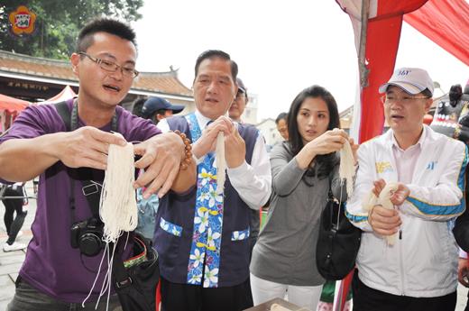 2013金門迎城隍-浯島宗教文化觀光季,金門縣政府昨推出兩岸三地的閩南民俗文化博覽會主題為「祭祀文化」。新竹市長許明財帶領一級主管共有45人,由縣長李沃士陪同到場體驗觀摩,他們盛讚金門縣政府將迎城隍活動做大、深化、熱鬧。 兩岸三地的閩南民俗文化博覽會主題為「祭祀文化」,昨下午2時30分起在總兵署盛大登場,內容有天公粿、粽子、結長壽麵線、發粿及八卦紅等民俗祭祀貢品大會集、燈火傳子嗣之子燈彩繪體驗、春橘留花香之春花、桔花製作體驗、七娘亭紮紙示範體驗等體驗與展示。 新竹市政府由市長許明財帶領一級主管共有45人,昨中午抵達金門展開為期三天的「地方發展與觀光產業創新學習營」。金門縣長李沃士親自到機場接機,同時陪同體驗迎城隍活動及參訪總兵署,儘管細雨霏霏,也不減參與的熱情。 李沃士特別代表金門鄉親向遠道而來的嘉賓表達熱忱歡迎之意。鄉親們報予掌聲歡呼:「新竹巿長好!」,讓新竹巿政府團隊感受到金門人熱情,有賓至如歸之感。李沃士說,新竹巿長許明財去年曾來金門參與迎城隍扛輦活動,今年也再度邀請共襄盛舉。 許明財盛讚金門迎城隍活動一年比一年有特色,感覺很棒!尤其在文化保存與傳承的用心,殊值得新竹巿學習觀摩。最令他們感到「驚豔」是金門縣政府將迎城隍活動擴大舉辦,已發展成金門最具代表性的觀光活動之一,吸引國內外遊客慕名而至。 新竹巿政府文化局長林榮洲說明,新竹「都城隍爺」是台灣官階最高。光緒年間海盜及亂事頻生,當地居民號召抵抗,傳說城隍爺顯靈襄助擊退,也因此由原「縣城隍」晉封為「威靈公」。廟內光緒皇帝欽賜『金門保障』親筆墨匾額及算盤,香火鼎盛。 金門迎城隍-浯島宗教文化觀光季,活動自四月二十日起,展開兩岸三地的閩南民俗文化博覽會,每一場次都有金好玩、金好康,民眾佳評不斷。昨現場還安排精采公揹婆表演,以及舞獅表演迎賓,同時展示金門完整祭祀文化。 李沃士、許明財也相偕體驗「結長壽麵線」,在金富貴的陳俊彥、林慧琴傳授技巧,大家一邊看、一邊跟著學習結長壽麵線,結出壽麵線形狀有模有樣,十分討喜,獲得讚美。據陳俊彥表示,口感香Q麵線,除了純手工外,還要天然氣候條件。 對金門仍保留著「新郎燈」民俗技藝,許明財也認為值得推廣傳承下去。據民俗專家葉鈞培老師說:「子婿燈」應正名為「新郎燈」,因為「新郎燈」是新郎提燈迎娶新娘而得名。若稱之為「子婿燈」,也只有岳父才能稱之。一般人通俗要稱之為「新郎燈」才對。 老師傅吳鼎文介紹「新郎燈」作法時指出,一對「新郎燈」,除了有傳統彩繪外,還有二個斗大字的新郎姓氏,每對「新郎燈」高約60公分、寬40公分,大小尺寸一樣,目前閩南廈漳泉福州與金門都仍保存此民俗。每對約莫要一天光景才能完成。 吳鼎文說,「新郎燈」是很傳統的閩南文化與民俗,金門人在子女迎娶都會各訂購一對「新郎燈」、一對「新娘燈」。目前又以鄉下訂購居多,與天公爐、天公燈等懸掛在大廳,展現鄉土文化,十分有特色,是公寓住家所沒有的。 博覽會還安排有「歡樂吧集戳活動樂」,民眾至活動現場領取戳章卡(每人限領二張),每張共有六個空格,凡體驗一項民俗文化者,就可蓋一個章,集滿六個戳章,即可至歡樂吧兌換民俗藝品一份,有花式棉花糖、捏麵人、龍鬚糖、中國結、劃糖人等多項種類! 此外,仍有打卡活動,民眾只要在5/5這天博覽會舉辦的期間,持手機「體驗民俗活動拍照+打卡+上傳FB」,即可至總兵署旅客服務中心兌換禮物,每人(含每一FB帳號)限領一份,數量有限,本週的禮物與之前的不同喔! 另由教育部青年發展署協助辦理的青年壯遊台灣活動,亦於總兵署舉辦相關民俗體驗活動,內容包含舞獅、跑旱船及蛤仔精體驗教學,時間為5/3~5、10~12及17~19之週五至週日,週五為下午五點半至九點半,週六、日則為上午九點至晚上七點,歡迎民眾多加利用參與。 「2013金門迎城隍-浯島宗教文化觀光季」的系列活動均為免費,今年內容多元,陣容盛大,藝陣表演、民俗體驗和打卡送好禮….等更多、更詳細的活動內容,可至「2013金門迎城隍」官方網站查詢,網址:412.kinmen.gov.tw/ 或 412.kinmen.travel/。