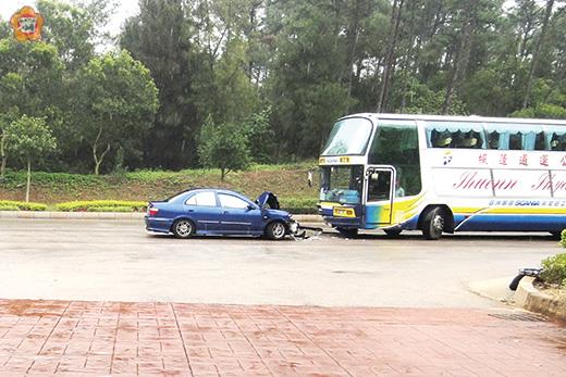 金寧鄉桃園路乳山遊客中心前路段前日中午發生一起遊覽車轉彎與直行的小客車相撞的車禍意外,自小客車車頭嚴重凹陷毀損,駕駛頭部撞擊車前玻璃輕傷送醫,而遊覽車右前保險桿受損,駕駛及乘客沒人受傷,雙方駕駛酒測值都是零,車禍原因正由警方進一步調查中。 根據金城警分局警備隊車禍處理小組的調查,這起車禍發生於前日中午十二時三十分許,張姓駕駛獨自開著6F-18XX自小客車由山外往金城方向行駛,藍姓駕駛開著ZZ-0XX遊覽車由金城方向往機場方向行駛,兩車行經桃園路時,遊覽車準備左轉金門國家公園乳山遊客中心,與直行的小客車於道路中線發生相撞意外。 金城分局警備隊指出,車禍造成自小客車車頭嚴重凹陷毀損,而遊覽車的右側保險桿也受損,張姓駕駛因頭部撞擊車前玻璃造成輕傷,已由消防人員送醫,而遊覽車藍姓駕駛與車內乘客無人受傷,因為車禍原因,遊覽車公司也緊急調派一部遊覽車接運旅客進行後續的行程。 警備隊表示,警方對於車禍雙方駕駛施以酒測,其酒測值都是零(沒有喝酒),正進一步調查車禍發生的真正原因。 金城分局也特別提醒駕駛朋友,桃園路為往來小三通碼頭與機場必經的道路,平日往來車多而且車速也較快,駕駛朋友行經該路段要轉彎時應記得提前打指示燈,並減速慢行,而直行的車輛也要留意車前狀況,不要超速,以維行車安全。