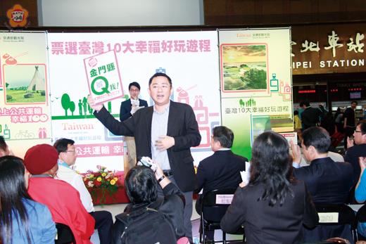 交通部觀光局「臺灣十大幸福好玩遊程」票選活動,昨下午14時假台北車站舉辦活動宣傳記者會。金門縣政府觀光處長楊鎮浯率團隊共襄盛舉,熱忱歡迎大家到最幸福的城市-金門旅遊,並懇請大家每天投一票給金門,讓人人幸福久久。 交通部觀光局為推廣公共運輸及低碳旅遊,結合全台22縣市舉辦「臺灣十大幸福好玩遊程」票選活動,整個活動除了初選、複選及網路投票之外,專業的評審團也將於五至七月進行實地踩線評比,並將於七月中公佈十大幸福好玩遊程的評選結果。 金門縣政府規劃的「跟著金門觀光巴士~漫遊趣!」二日遊行程,融入在地低碳旅遊概念,並有完成的景點接駁服務,已經通過交通部觀光局的初選,接下來參加的是第二階段的網路票選。交通部昨舉辦活動宣傳記者會。 另交通部觀光局為了鼓勵國人踴躍參與「臺灣十大幸福好玩遊程」票選活動,特別準備多項好禮,民眾只要在活動期間上網為最愛的幸福好玩遊程投下一票,就有機會獲得超商千元禮券及行車紀錄器,還有價值一萬二千元的花蓮遠雄悅來飯店「經典套房」住宿券。 金門縣政府邀請大家自四月三十日至六月三十日,每天上網投一票給金門縣的「跟著金門觀光巴士~漫遊趣!」二日遊行程。活動網址http://www.taiwantour102.com。 根據交通部觀光局指出,本活動將於七月底公佈「臺灣十大幸福好玩遊程」一日遊、二日遊各十條遊程的決選結果。決選方式除了專業評審實地訪察評分外,也於五月三日召開記者會,邀請民眾上網投票,各縣市亦將以創意設計的QRcode催票並推薦遊程。 已入圍的遊程可以進入「臺灣10大幸福好玩遊程」衝刺人氣,未入圍初選的遊程仍可經由人氣PK,爭取進入十五席決選資格名單。所有報名的遊程資料都將同步上網,讓民眾參考如何以低碳公共運輸體驗「幸福好玩」遊程,期許讓臺灣旅遊的服務與品質精益求精,成為世界的觀光品牌!