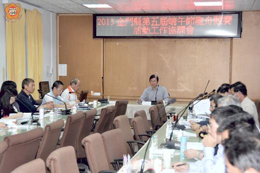 金門縣政府昨日召開2013金門縣第五屆端午節龍舟競賽活動工作協調會,敲定龍舟賽訂於六月十二日上午八時三十分起,在古寧頭雙鯉湖關帝廟前舉行祭神及龍舟點睛及下水儀式後,正式在雙鯉湖比賽。並將搭配有民俗才藝表演、寫生比賽、漆彈射擊活動。 金門縣第五屆端午節龍舟競賽工作協調會,昨日上午九時起在金門縣政府第二會議室舉行,由縣府秘書長盧志輝主持,金門國家公園管理處、金酒公司、消防局、警察局、金寧鄉公所、環保局、衛生局、金門大學、金門體育會、金門縣運動管理學會、古寧國小、縣府行政處、金門縣立體育場、林務所、農試所、畜試所、水試所、車船處等,派員參加。會中,並就各配合單位進行工作協調、討論。 主持協調會的縣府秘書長盧志輝希望各配合單位全力協助和預作準備,並注意水上活動人員競賽安全要擺第一;參賽隊伍無論賽前練習或正式比賽,都要穿著救生衣。並歡迎各單位踴躍組隊報名參賽,讓龍舟賽逐年形成氣候,規模逐步擴大,更吸引觀光客來金參訪、體驗。 金門縣第五屆端午節龍舟賽,訂於六月十二日上午八時三十分起,在古寧頭雙鯉湖關帝廟前舉行祭神(公祭關聖帝君)、龍舟點睛及下水儀式後,並舉行開幕典禮,隨即展開龍舟競賽。並在競賽中,穿插民俗才藝表演、辦理寫生比賽和漆彈射擊活動。預定當日下午四時二十分舉行閉幕典禮。 競賽組別上,分成: 一、社會男子組:金門地區各機關、團體、學校組成之。 二、鄉鎮村里社區男子組:金門縣各鄉鎮村里社區組成之。 三、女子組:金門地區各機關、團體、學校暨鄉鎮村里社區組成之。 為提升金門縣龍舟運動水準,將邀請大陸組二隊蒞金觀摩賽。 龍舟競賽參加辦法,凡組隊參加者自即日起至五月十五日下午五時止,填妥大會印製報名單一式二份,一份自存,一份逕送國立金門大學管理學院2F。連絡電話:082-312703鄭先生。傳真:082-312704。或e-mail:tf350@nqu.edu.tw(請註明龍舟賽報名表)或金門大學網站下載報名資料:(http://www.nqu.edu.tw/)。 而各組參加人數上,採五對槳,每隊限報職員二人(領隊、教練兼管理各一人)、選手十四人(槳手十人、舵手一人、鼓手一人、替補二 人)。 獎勵方面,各組競賽依報名隊伍多寡分別錄取優勝隊伍頒發獎金、獎盃。 而參賽隊伍頒發參賽獎乙份。社會男子組和鄉鎮村里社區男子組,第一名獎金一萬元、第二名六千元、第三名五千元、第四名四千元(參賽隊伍未達六隊時獎金減半);社會女子組第一名六千元、第二名四千元、第三名三千元。至於配合端午節龍舟賽所舉辦的漆彈射擊活動,將於六月十二日上午八時三十分起採現場報名(名額二百名,額滿為止),歡迎對漆彈射擊有興趣者,均可現場報名參加。活動規則,為漆彈射準,每人五發漆彈,射擊靶標,每人限射擊一個靶標;並於當日上午十時起依號碼牌順序開始就位,由指導人員指揮進行射擊;射中靶標,打開寶物,兌換獎品。並於下午一時至二時進行獎品兌換,逾時視同棄權。 在寫生比賽方面,六月十二日上午八時三十分至十一時三十分,在古寧頭雙鯉湖一帶舉辦,將分國中組、國小高年級、中年級、低年級組、幼兒組,計五組比賽。比賽一律當天採現場報名方式,並於十一時三十分截止收件。各組將錄取前六名,頒發獎狀乙幀及獎品乙份;佳作各組擇優錄取若干名,頒發獎狀乙紙。