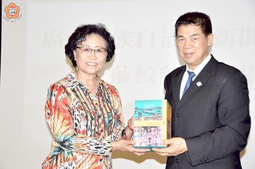 廣西壯族自治區新聞出版局局長于瑮,昨日下午率同廣西出版界一行走訪國立金門大學,並捐贈桂版圖書五百四十五冊予金大圖書館收藏。于瑮希望透過這項捐書,更延伸加強兩地交流合作,助益金大學生了解中華文化。 金門大學校長李金振也以廣西文化多元,和金門以閩南文化為指標,都是中華文化一部分的相得益彰,除感謝廣西壯族自治區新聞出版局的贈書,並期以此更建立雙方永久友誼。 于瑮昨日下午率同來自廣西壯族自治區出版界一行二十六人,於前抵國立金門大學參訪時,並受到金大校長李金振、金門縣政府教育處副處長陳金文等人歡迎。 李金振表示,廣西是全中國最美地方,又居西南各省重要戰略地位,在文化多元,出版界豐富,這次學校獲贈捐書,並代表學校師生致十二萬分謝意;對於這項豐盛的禮物,十三箱廣西文獻、書刊,對大學無異是無價之寶,且是金大圖書館一大收穫,並期以此更建立雙方永久友誼和聯盟橋樑。 于瑮則表示,一年一度的對台經貿交流,除了在台北、花蓮進行寶島圖書巡展,也由廣西壯族自治區八個出版社捐贈價值約台幣十萬元的廣西文學、歷史、美術、少兒教育、風土人情等優秀圖書五百四十五冊,是希望給予培養人才重要基地的金門大學,學生更了解中華文化。 她並表示,廣西和金門都是同樣中華民族,在壯族自治區還有十一個少數民族,是希望透過雙方交流合作,讓中華民族文化更繁榮壯大。而金大學子也能透過贈書認識簡體字,並期透過金大作品學習繁體字,更促進雙方加強合作交流。
