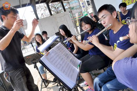 金門大學管樂社昨天下午在金湖鎮新巿里廣場對空播種音樂的豆芽菜,希望讓金門假日的空氣,瀰漫藝術的氛圍。昨天這場演出,是「經典狂響-感動再臨」成果發表會的「前奏」。 「經典狂響-感動再臨」將於五月三十一日(星期五)晚上七點半在金門大學楊肅斌演藝廳舉行。為了宣傳活動,為了募集小額捐款,金大管樂社昨天在新巿里進行街頭表演。 當他們在木棉花道圍成的廣場中合奏時,音符陣陣飄揚,花兒朵朵墜落,春燕上下頡頏,行人徘徊聆聽;許多人都有意外的收穫,還有小學生或更小的幼童也拿出硬幣,投入琴盒,支持大朋友們的文化活動。 樂團指揮林廷謙表示,管樂是一種興趣、一種自我超越,在這個領域中,大家可以拋開工作及讀書的壓力,並藉由公演,由「獨樂樂」擴大為「與人樂樂」及「眾樂樂」。他推薦大家聆聽〈馴龍高手〉-這首來自卡通動畫的曲子,有澎湃、激昂,也有柔情。 管樂社社長蕭育欣表示,「經典狂響-感動再臨」挑選的曲子,都是讓人一聽就有感覺的作品;她希望管樂可以變成「平易近人」的藝術表演,不要因為「曲高和寡」而遠離大眾。她推薦大家聆聽〈花木蘭〉-這首曲子風行的期間,正是金大管樂誕生的年代,花木蘭行行重行行克服重重難關的情節,對應了金大管樂不服輸、拚到底的毅力。 樂團的鼓手鄭詔仁希望金大管樂能帶動金門假日的藝術氣息;他推薦大家聆聽《悲慘世界》中的〈I dreamed a dream〉(我曾有夢)。 「薩克斯風」樂手胡育寧表示,他想用得自管樂的感動,帶給聽眾快樂。「法國號」樂手于善任認為欣賞管樂是很好的休閒,可以讓人輕鬆;他推薦大家聆聽〈鐵達尼號〉-讓音樂帶著聽眾飛行,就像蘿絲由傑克抱著,在船頭張開雙手彷如展翅一般……。 「經典狂響-感動再臨」音樂會的曲目包括:〈快樂的出航〉、〈悲慘世界〉、〈歌劇魅影〉、〈鐵達尼號〉、〈神鬼奇航〉、〈流浪到淡水〉、〈花木蘭〉、〈空港〉、〈馴龍高手〉、〈星際大戰〉。 演出人員包括:長笛-耿翊,韋欣宜,林筱凡,許力心,郭瑾卉。豎笛-黃子馨,曾郁文,周品均,張冠博。中音薩克斯風-虞旋,吳岱軒。次中音薩克斯風-胡育寧,陳雅靖,李韶華。小號-蕭育欣,張志鑌,耿令怡,文胤臣。法國號-于善任,沈奕劭。長號-李旻勳。上低音號-黃柏竣,王怡茹。低音號:李誌軒。打擊:鄭詔仁,鄧雅菁,左雲慈,李俊澤。 國立金門大學管樂社成立於民國八十九年,由各科系的愛好音樂者共同發起。在李金振校長、彭泉學務長與蔡宗憲組長帶領下,曾多次參加教育部「教育優先區」以及「大專院校社團帶動中小學社團發展活動」。石蚵文化節、大同之家表演、福田家園教養院等,都有他們演出的足跡。 金大管樂社以「短小精幹」自我惕勵,雖然社團「年紀輕、規模小」,但團員們認真、有志氣,希望秉持對音樂的熱誠,在課業之餘,用音樂美化人生,把好音樂散播到社區,讓社會充滿藝術氣息。