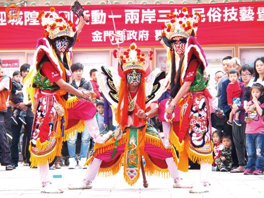 2013年金門迎城隍-兩岸三地民俗藝陣博覽會,愈來愈有看頭!昨邀請台灣、大陸及金門等地的民俗技藝高手齊聚總兵署同台演出,輪番展演泉州傀戲、雜技秀、宋江陣及布袋戲等精采好戲,吸引上千名親子及遊客體驗,現場驚呼聲連連,共歡度週日快樂時光。 昨天的總兵署特別不一樣,縣府推出有10大民俗表演節目、8個體驗攤位,以及歡樂吧安排有捏麵人、龍鬚糖、吸管編織、竹蜻蜓、花式棉花糖等,所準備上千份禮物,全部大放送,一個也沒剩。每一攤位更是大排長龍,到處人擠人,有如一超級嘉年華會。 其中,「敘舊布袋戲園」原是台灣首創布袋戲主題餐館(1992年創立,2013年TLC旅遊生活頻道Bob Blumer報導為「全球怪餐廳」、各國來台觀光團文化景點),為了讓來自世界各國的貴賓及國內親子能賞玩台灣布袋戲而成立的劇團。團長陳建華接受訪問時指出,該劇團以創新「互動、驚奇、歡笑、體驗」特色見長,這次金門演出特別安排親子互動式布袋戲表演,主題有福官弄獅,是熱鬧喜氣戲劇;再來是示範介紹布袋戲如掌中戲、金光布袋戲與電視布袋戲。 最壓軸是親子同台表演,陳建華以簡單故事引導非專業金門大、小朋友入戲台表演,讓親子置身戲中,享受演戲的樂趣,縣府觀光處也備有好禮相送。陳建華多年來除在餐館演出外,亦不斷獲邀赴國內外各地表演推廣,深獲佳評。 「傳統雜技」舞台演出與現場民眾互動趣味體驗,演出內容:飛旗舞動-結合耍旗技巧、特技翻滾跳躍的演出。飛天柔語-以軟骨舞蹈呈現敦煌壁畫中飛天仙女的意境。快手雜耍-各式各樣的雜耍技藝演出。巧轉花毯-結合舞蹈身段與轉毯技巧的演出。 馬戲雜技,聽起來很厲害,是很專業的表演,不過,台灣國寶李棠華爺爺要告訴金門小朋友:學習馬戲雜技不是只為了表演,而是可以訓練體魄、訓練平衡,還可以讓您眼明手快、增加專注力喔!吸引小朋友體驗馬戲練雜技,歡樂聲連連。 還有眼明手快(丟圈、砌磚)、踩蹺體驗。創意宋江陣,以新穎表演模式,結合多方元素,激發更多表演的火花,顛覆傳統宋江陣的刻板印象,以新一代的創新方式,將傳統保留傳承,搭配新生代的藝術文化,變化成現今的創意宋江陣。 「泉州傀戲」,則由大陸國寶級大師擔綱演出,表演節目包括馴猴、猴子踩單車、小沙彌下山,精湛演出,令小朋友高興直拍手,還一再要求「再演一次」,受歡迎程度可見一斑。其中不少台灣的遊客讚不絕口,他們說:「實在有看頭!不虛此行」。 另拍胸舞、車鼓弄、公揹婆、官將首、戰鼓等等節目表演,為博覽會帶至空前熱鬧,炒熱迎城隍氣氛。據金門旅行業者表示,台灣各縣巿均推出特色的觀光季,目的就是帶動經濟,有人潮就有錢潮。另商家也肯定縣府觀光政策,值得大力推廣。迎城隍-兩岸三地民俗藝陣也是親子最愛。