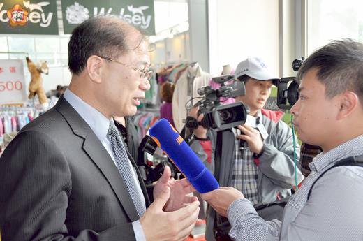 李增汪/圖文 「金門風獅爺免稅批發商店街─2013 MIT商品展銷會」昨隆重舉行開幕儀式,吸引中、港、台三十六家媒體採訪報導。 縣長李沃士也成為媒體採訪焦點,採訪議題不外金門對外招商引資、金門大橋興建、大二膽島開放觀光、自大陸接水等。