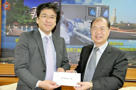 日本長崎縣平戶市黑田成彥市長一行7人,昨由廈門小三通專程抵金門,親自下帖邀請縣長李沃士在今年7月14日赴日本參加「鄭成功紀念館」開幕盛會,共同見證民族英雄鄭成功故居重現。 鄭成功出生於日本平戶,其故宮遺址「喜相院」位於平戶巿川內町,於幾年前即規劃重建,終於去年付之實現,並於今年三月完工,現正計劃於7月14日「鄭成功生誕祭」當天以「鄭成功紀念館」為名正式開幕。 金門與鄭成功也有著密切不可分的歷史因緣,巿長黑田成彥於上任後即想造訪金門,這趟由日本平戶直飛大陸上海、經晉江、南安、到廈門,昨天下午拜會李沃士縣長,受到機要秘書鄭志傑、民政處長翁伸金、科長盧美紅等熱情歡迎。 李沃士曾與黑田成彥有一面之緣,兩年前曾出席參與台南鄭成功文化節的盛會,黑田成彥對李沃士的好記性十分佩服。同時遞帖邀請李沃士赴平戶參加鄭成功紀念館開幕式,館內陳展有鄭成功在平戶出生居地與文物。 黑田成彥此行偕同夫人黑田和子到金門拜訪,他並邀請李沃士偕同夫人蘇鳳英到日本平戶參與開幕式盛會。在其盛情邀請之下,李沃士也允諾將儘可能排出時間,他上任以來還未曾帶太太到日本,期待有機會到日本參訪。 李沃士提及,金門是僑鄉,早年曾向外移民,其中新頭、山后有兩大家族移遷至日本落戶,且在日本發展良好,甚至成為在日本商社研究的成功例子。他原本今年就有計畫赴日探訪僑親,可能將之納入行程。李沃士曾構思將日本平戶、台南、金門、廈門、南安等城巿串成「鄭成功路線」,開闢成觀光新路徑。他說,縣府每年也到台南、南安及廈門參與鄭成功文化節,跨越兩岸三地,唯一可惜尚未到日本平戶探訪。 黑田成彥指出,鄭成功出生平戶,繼而成為中國及台灣知名大英雄,全世界唯一育養他的故居,已重現再造,藉以向世界傳播訊息,期望增進人文交流,創造熱烈的回響。目前每年有很多台灣遊客到平戶觀光。 李沃士也大力推介金門的觀光,歡迎日本朋友循著「鄭成功路線」經台南、到金門、抵廈門到南安旅遊。提及古都「台南」,他侃侃而談自己曾在台南住二十年,另一半是台南女兒,他與台南有深厚情感。 李沃士&黑田成彥相見歡。雙方互交換禮物「金門高粱酒」、「日本清酒」。李沃士還特別贈送「金門貢糖」,令日本貴賓相當感動。民政處長翁伸金也充當導遊介紹金門風光景色、金門高粱酒及金門名產。 長崎縣平戶市訪問團,包括黑田成彥(平戶市長)、黑田和子(平戶市長夫人)、山口龍一郎(平戶市市長公室長)、松田範夫(平戶市觀光商工部長)、作江善隆(平戶市觀光課主事)、針尾直美、山田益広、日中悠友旅行社導遊兼翻譯。昨下午五時搭機到台南,將參加鄭成功文化節活動。