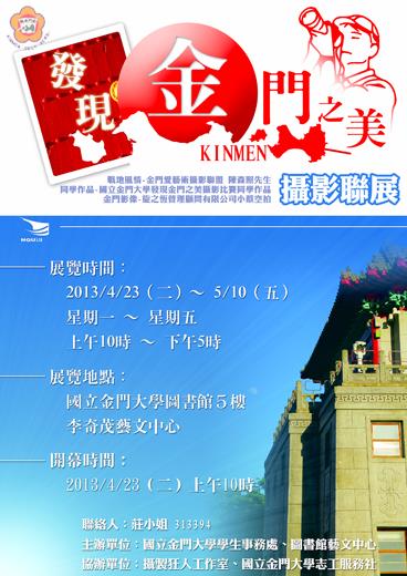 「發現金門之美攝影聯展」,將自今(23)日至5月10日每天上午10時至下午5時假金門大學圖書館5樓李奇茂藝文中心展出,內容精彩,金門大學歡迎各界人士共同來欣賞金門之美。 由國立金門大學學生事務處、圖書館藝文中心主辦,攝製狂人工作室以及金門大學志工服務社協辦的「發現金門之美攝影聯展」,若有相關問題可於上班時間電洽國立金門大學圖書館:313394莊小姐。 將分三大主軸展出,分別為金門大學「發現金門之美」攝影比賽同學得獎作品、金門愛藝術攝影聯盟陳森照先生戰地風情攝影作品以及旋之恆管理顧問公司蔡文祐先生金門影像攝製作品。 金門大學學生事務處自102年度開始規劃一連串主題月之活動,本學期預計將舉辦發現金門之美攝影創作展覽、戀戀五月曲性別平等教育主題月、畢業季破繭高飛主題月。深富意義。 「發現金門之美攝影聯展」活動內容精彩。金大希望透過主題性活動,推展學生活動以及兩性平等教育。以及豐富學生正當興趣,培養學生的軟實力,培養未來職涯能力。