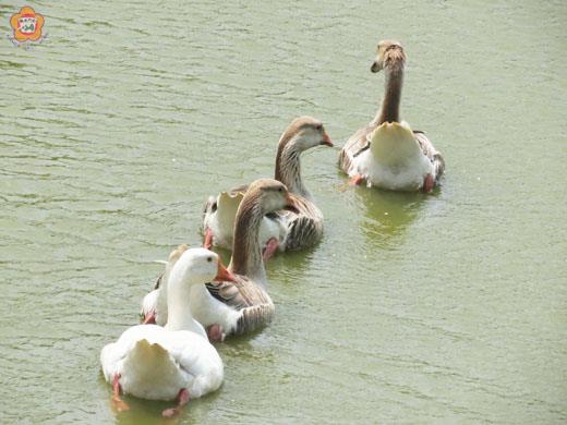 榮湖常有一群鵝在水中以身為筆進行波磔點畫。牠們肚疊胸高,走八字步,搖頭晃腦,成隊出沒,把浦頭與水頭之間的榮湖「上池」變成了「鵝池」。不過,牠們卻成了人們通緝的對象-八去其半,如今只存其四;一白三褐,兩兩縱橫分合。 這群鵝常漫步於水頭「汶源宮」往環島東路的榮湖畔,由「領頭鵝」像「班頭」鵝般,帶著「班兵」鵝閒步覓食。「領頭」鵝如往東,「班兵」鵝就往東;「領頭」鵝若往西,「班兵」鵝也往西。不過,偶然也會有那麼一隻「天兵」發現自己轉錯了方向,於是三步併做兩步,慌忙歸隊,樣子看起來很逗趣。 這群鵝是「三棲部隊」,能走能游能翔;牠們可能是「開小差」(脫隊)、「騰翅子」(逃走)的家禽。看到有人過於逼進,就會展翅飛入榮湖避險。牠們會在水中呈一路縱隊或以四角合圍捕食,亂中有序,製造出大大小小的水波與漣漪。在榮湖「汶鳳殿」對向靠水頭及環島東路的池畔,也是牠們經常覓食的地方;在這裡,獨行的白鷺鷥和落單番鴨子等孤鳥也會與牠們和平為伍。 據金沙鎮鎮民代表黃聰成表示,這群鵝原本應該是有人養的,可能是後來溜走或是有其他原因,變成了野鵝。不過,附近人家沒有任何人承認自己是飼主。他說,為了防止污染,自來水廠的人員曾經對牠們施展過捕捉的行動,但牠們非常機警,並沒有被得手。不過,這一群鵝原本有八隻,可能因為沒有足夠的東西吃,已經死了一半。 華人寫毛筆字常用的「雙鉤執筆法」又叫做「鵝頭執筆法」-執筆時是以食指和中指向內鉤住筆,與拇指相對。由於食指指節彎起,狀如鵝頭,因此得名。 歷代最偉大的書法家首推晉代的王羲之;傳說王羲之愛鵝,曾由鵝身上領悟書法。他曾經為道士寫《黃庭經》以換取一群鵝,因此後世用「黃庭換鵝」或「白鵝書」、「鵝經」來形容書法高妙。浙江省紹興縣山戒珠寺有一口池塘被稱為「鵝池」,相傳就是王羲之的養鵝處。 榮湖鵝群的出沒,雖然讓這一帶的景緻變得活潑生動;不過,基於淨化水源等理由,牠們似乎變成不速之客。好在牠們不是北方來的候鳥,否則此時還可能被懷疑是否帶有流感病毒(H7N9)呢! 昨天中午,這群鵝沒有出現在榮湖畔;一位常在湖畔休息的男子表示,可能往蔡店方向去找東西吃! 環榮湖一帶,曾出現一些有趣的畫面-除了這群被通緝的鵝之外,還有喜歡睡在樹上的狗(黃聰成養的)、會游泳的豬(黃思金飼的)、拖著大輪胎學牠犁的黃牛……。