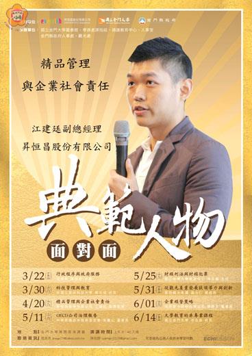 由國立金門大學、金門縣政府人事處共同舉辦的「服務管理趨勢講座」,明(20)日上午9時40分假金大陳開蓉會議廳登場,邀請到昇恒昌江建廷副總經理以「精品管理與企業社會責任」為題進行專題演講,歡迎各界人士聆聽。 這項講座將舉行財團法人昇恒昌基金會101年度清寒優良獎學金頒獎典禮,由昇恒昌股份有限公司江松樺董事長的獨子江建廷副總經理主講,自加拿大學成歸國後積極在國內企業界與社會貢獻己力服務大眾。 主辦單位期待透過此次講座鼓勵青年學子突破社會新鮮人的藩籬、拾得就業的企圖心,並以精品管理與企業社會責任的角度強調企業與個人的命脈連結,進而嘉勉學子積極培養個人對社會的責任,以求盡善盡美的工作態度在未來職場上發光發熱。 金大指出,自去年12月開始,國內最大的免稅集團昇恒昌與旗下所屬昇恒昌基金會特別捐助金門大學,成立校內首個企業講座。希望透過昇恒昌基金會及昇恒昌免稅集團在產業界的影響力,培養學生的宏觀視野與相關能力。 講座宗旨以「典範人物面對面」為主軸,內容包括產、官、學在服務管理過程中的過去、現在、未來的發展及經驗,更重要的是未來的發展態勢與挑戰,達成培養健全人格、民主素養、法治觀念、人文涵養、強健體魄。 另五場安排為5/10(五)「OECD公司治理報告」-中華民國證券發展基金會董事長吳壽山、5/25(六)「財經刑法與財經犯罪」-國立台灣大學歐盟中心主任陳志龍、5/31(五)「從觀光產業發展談領導力與創新」-雲朗觀光集團總經理盛治仁。 六月份安排6/01(六)「企業經營策略」-前悠遊卡股份有限公司董事長連勝文,以及6/14(五)「大學教育的非專業課程」-國立金門大學校長李金振。