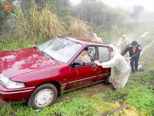 一部自用汽車在后扁出海口陷入泥灘,金門岸巡總隊的人員在風雨中協助駕駛人讓汽車脫困。 根據金門岸巡總隊的說明,海岸巡防署中部地區巡防局第九岸巡總隊田埔安檢所實施岸際巡邏時,發現后扁出海口處有一部汽車的車輪深陷泥地無法行駛,立即主動給予協助。 由於雨水讓泥地變得鬆軟濕濘,駕駛人為了掃墓而受困於當地。岸巡人員以勤務車輛繫繩在前拖拉,同時以人力推車;雨溼外衣,汗流內衣,搞得滿身泥濘,終於協助民眾解決問題,也獲得受助者的感謝。