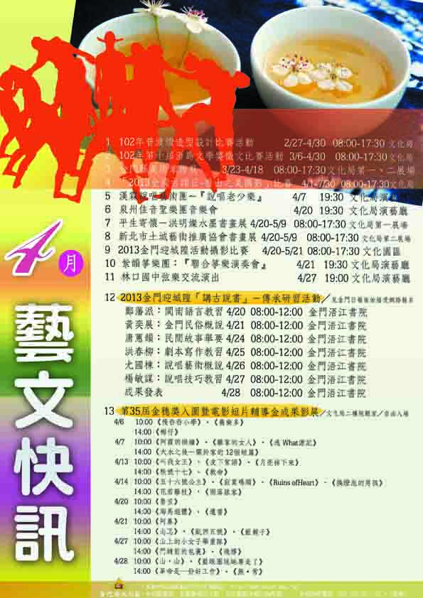 配合2013金門迎城隍,金門縣文化局安排系列精采藝文活動,規劃有「金門迎城隍活動攝影比賽」、「2013金門迎城隍「講古說書」-傳承研習活動」等多項,值得一提是,整月推出第35屆金穗獎入圍暨電影短片輔導金成果影展,歡迎縣民共享豐富藝文饗宴。 文化局四月份藝文活動如后: 1.102年普渡燈造型設計比賽活動2/27-4/3008:00-17:30文化局。 2.102年第十屆浯島文學獎徵文比賽活動3/6-4/3008:00-17:30文化局。 3.金門縣美術家聯展3/23-4/1808:00-17:30文化局第一、二展場。 4.「2013全國古蹟日-碧山之美攝影」比賽辦法4/1-7/3008:00-17:30文化局。 5.漢霖說唱藝術團~『說唱老少樂』4/719:30文化局演藝廳。 6.泉州佳音聖樂團音樂會4/2019:30文化局演藝廳。 7.平生寄懷-洪明燦水墨書畫展4/20-5/908:00-17:30文化局第一展場。 8.新北市土城藝術推廣協會書畫展4/20-5/908:00-17:30文化局第二展場。 9.2013金門迎城隍活動攝影比賽4/20-5/2108:00-17:30文化園區。 10.紫韻箏樂團:『聯合箏樂演奏會』4/2119:30文化局演藝廳。 11.林口國中弦樂交流演出4/2719:00文化局演藝廳。 12.2013金門迎城隍「講古說書」-傳承研習活動。鄭藩派:閩南語言教習4/2008:00-12:00金門浯江書院。黃奕展:金門民俗概說4/2108:00-12:00金門浯江書院。唐蕙韻:民間故事舉要4/2408:00-12:00金門浯江書院。洪春柳:劇本寫作教習4/2508:00-12:00金門浯江書院。尤國棟:說唱藝術概說4/2608:00-12:00金門浯江書院。楊敏謀:說唱技巧教習4/2708:00-12:00金門浯江書院。成果驗收4/2808:00-12:00金門浯江書院。 13.第35屆金穗獎入圍暨電影短片輔導金成果影展/文化局二樓視聽室:4/0610:00《慢吞吞小學》、《養樂多》。4/0614:00《椰仔》。4/0710:00《阿霞的掛鐘》、《離家的女人》、《逃 What源記》。4/0714:00《大水之後—關於家的12個短篇》。4/1310:00《叫我女王》、《皮下絮語》、《月亮掉下來》 4/1314:00《根號十七》、《救命》。4/1410:00《五十六號公主》、《寂寞碼頭》、《Ruins ofHeart》、《換燈泡的男孩》。4/1414:00《花若離枝》、《雨落誰家》。4/2010:00《魯笠》。4/2014:00《海馬迴體》、《遺書》。4/21 10:00《阿鼻》。4/2114:00《忐忑》、《凱西五號》、《藍鬍子》 4/2710:00《山上的小女子舉重隊》。4/2714:00《門縫前的包裹》、《殘膠》。4/2810:00《山‧山》、《藍眼圈說她要走了》。4/2814:00《革命是一份好工作》、《無‧常》。