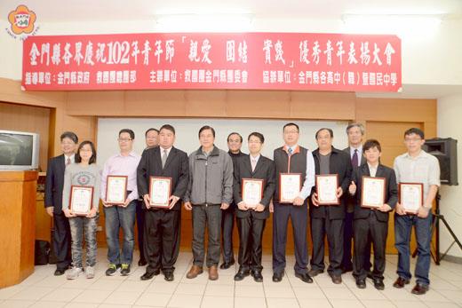 獎勵上進民眾、表揚優秀青年!金門各界慶祝一○二年青年節表揚大會昨假救國團金門團委會登場,由縣政府秘書長盧志輝頒獎表揚地區各界優秀青年,他期許青年們應該扛起社會責任,為金門、為國家奉獻己力,以行動回報自己的家鄉。 這項表揚大會是在昨天早上九時三十分假救國團金門團委會舉行,由團委會總幹事王群元主持,會中並邀請縣府秘書長擔任頒獎貴賓,而各所學校校長與得獎者家屬踴躍出席,表揚大會是喜氣洋洋、熱鬧非凡。 會中,盧志輝一一頒獎表揚得獎者,並穿插社團表演喜年華,盧志輝也在致詞過程中勉勵得獎者,繼續以熱心助人、敬業樂群的態度服務社會。而在此次的表揚大會中,得獎者分別有社會優秀青年的林政宏、吳正中、陳邦祥、李育賢、周清曜、陳宗駿、蔡云仁、莊嘉銘、黃子蔚、陳嘉瑜、李大年、王從武。 至於在中等學校優秀青年當選人則有金門高中的郭姮彤、張綺驛、陳曼昀、李昊倫、呂佳穎、薛宇;金門農工的倪佳鈴、許芳語、莊晉、翁振文、楊雨慈、翁政哲、張啟三、李芷婕;金城國中楊皓瑋、金湖國中林聖傑、吳雅勻、金沙國中梁佳喻、烈嶼國中林哲鍏。