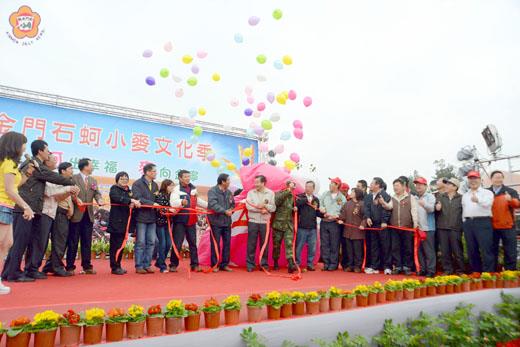 由縣府與金寧鄉公所聯手主辦的「蚵出幸福·麥向金寧」二○一三年石蚵小麥文化季昨日假古寧頭和平紀念廣場舉行,副縣長吳友欽、金寧鄉長陳成勇在開幕典禮中巧扮「麥蚵傑克森」,正式宣佈石蚵小麥文化季啟動,廣邀地區民眾前往參與,一起徜徉在麥田蚵香的自然天地裡。 這項開幕典禮是在昨天上午九時整,假古寧頭和平紀念廣場舉行,金寧鄉鄉長陳成勇在開幕中感謝當地農民、蚵民與縣府的協助,讓鄉內的石蚵小麥文化季能延續進行,他同時熱誠邀請地區民眾在活動期間前往參訪,一起探訪金寧鄉美麗的農業景觀,品嚐新鮮的石蚵料理。 而副縣長吳友欽也在開幕典禮中與陳成勇抹黑臉龐、穿上表演服裝,巧扮「麥蚵傑克森」手持小麥與石蚵向在場觀眾介紹這兩樣當地的名產。吳友欽表示,縣府致力推動一鄉一特色,石蚵與小麥就是金寧鄉當地最具賣點的產物,他希望透過這些相關活動的舉辦,提昇鄉鎮的觀光競爭力,吸引更多遊客到訪遊覽,觀賞金寧美麗的麥田風光。 開幕儀式中,主辦單位也邀請到電音三太子、北門醒獅團為活動暖身開場,並由副縣長吳友欽、金寧鄉長陳成勇、金管處副處長盧淑妃、各鄉鎮長及縣府一級主管等人共同揭牌,宣告石蚵小麥文化季啟動。 活動主辦單位則在園區內陳展石蚵農特產,並邀請公務單位進行宣導,配合推出各項成果展示及攝影作品展,以及小麥調製體驗、肚皮舞、氣球達人表演等,現場氣氛熱鬧非凡。