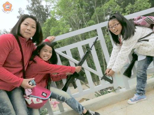 張建騰/圖文 左手受,右手施! 洪家萱(右一)、洪家慧(左二)姐妹昨天參加家扶中心的活動,在柳營進行軍事體驗,並用固著的道具模擬了一場假廝殺。妹妹洪家慧的志願是長大當家扶中心的老師。 他們母親洪亞本(左一)是一位「自強媽媽」,經常製做手工藝提供家扶中心義賣。洪亞本對女兒的教育是「左手收,右手還」;接受別人的幫忙之後,要懂得回饋。