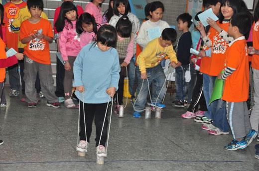 賢庵國小慶祝兒童節,以陀螺、滾鐵圈等傳統童玩,讓孩子反璞歸真,尋回最純真的兒童節,同時愛心媽媽社的家長們手作點心,送給孩子們享用,以及金大魔術社到校表演,讓賢庵學生提前度過一個不一樣的兒童佳節。 賢庵國小慶祝兒童節,於昨日下午一時五十分起,舉辦一場「童玩邀春光一『童玩』韶年」活動,準備打陀螺、滾鐵圈、踢毽子、高蹺、扯鈴、呼拉圈、跳繩等八種傳統童玩闖關活動,讓小朋友們玩得不亦樂乎。而金大魔術社由社長張光瑋帶領王昱硯、邱浩逸等蒞校表演,精彩魔術逗得賢庵學童歡笑不斷。 賢庵國小表示,舉辦這場活動,是希望藉這樣的體驗來認識古早味的傳統童玩,讓現在被電子產品圍繞的孩子度過一個快樂而有意義,充滿歡樂又健康的兒童節。昨日準備的童玩,已經先行在該校垵湖分校推廣一段時日,因此垵湖學子各個都是童玩高手。所以昨日設計的各種闖關遊戲中,便是由垵湖的孩子充當小老師,從旁提點技術不純熟的賢庵同學。 校長陳為信也說,透過童玩讓孩子學習,可以充實並豐富心靈層面,極富教育意義,昨日活動也獲家長的相當支持。他也相當感謝該校愛心媽媽社長甯曉華、副社長洪梅蘭、總幹事王詩韻及志工成員,在擔任台開主廚同時也是該校家長的王銘聰的巧手帶領下,製作了奶酪、銅鑼燒及餅乾,送給全校學子享用。
