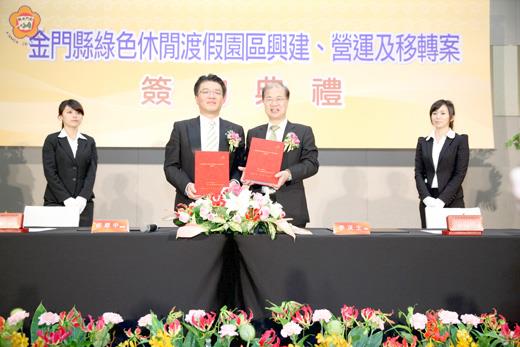 看好金門旅遊觀光市場潛力!金門縣政府昨與富驛、新光不動產開發、新光建經共同組成的金門樂活假期酒店共同完成「綠色休閒渡假園區」BOT簽約儀式。初期投資為12億元,目標在2016年開幕營運,將成為金門觀光旅遊的新亮點。 「綠色休閒渡假園區」BOT簽約儀式,昨下午在台北寒舍艾美酒店舉行簽約儀式,由金門縣長李沃士代表金門縣政府與金門樂活酒店股份有限公司董事長侯尊中共同主持並完成簽約,並在財政部促參司司長曾國基、來自各縣市旅台鄉親及企業界朋友近300多位貴賓共同見證。 李沃士縣長指出,金門縣政府以推動「文化金門」與「觀光立縣」為縣政之主軸,和金門樂活假期酒店公司合作,就是希望能將金門縣的觀光旅遊市場擴大,加速讓金門轉型發展為旅遊觀光休閒新勝地,打造成國際觀光休閒島嶼。 李沃士表示,金門環境幽美、空氣清新,擁有豐富的戰地史蹟及閩南文化,也是兩岸中轉樞紐,開放大陸人士來金門作延伸性旅遊後,將帶動無限的商機,後續將推出「護理機構及健康養生社區案」、「莒光湖商務旅館案」、「中山林段產業專用區案」、「水頭港國際經貿園區案」等開發案,歡迎企業界朋友踴躍來金門投資。 侯尊中指出,金門樂活假期酒店公司,是由台灣富驛、台灣新光不動產開發、台灣新光建經等共同組成,目前標下佔地約4.55公頃的金門縣綠色休閒渡假園區BOT案,初期將會以12億元規畫建設整座渡假園區。主要是對投資金門觀光旅遊市場深具信心。 侯尊中強調,金門綠色休閒渡假園區規劃包含有Villa式旅館、戲院表演廳、水上主題樂園、商店街以及結婚禮堂等主題,其中結婚禮堂的規畫,主要是配合金門縣政府將把金門規劃為「婚慶島」的發展所設計,預料未來園區的結婚禮堂將會是新人拍婚紗與結婚的熱門景點。 縣府推動「綠色休閒渡假園區」BOT案,地點位處林務所森林遊樂區內,開發土地面積約4.5公頃,目前是本縣重要觀光旅遊景點,為因應觀光產業發展及生態旅遊推廣所需,縣府依促參法第46條民間自提方式BOT模式辦理開發,以觀光遊憩重大設施為開發主體。 主要規劃以villa型式為主之休閒住宿設施。一方面鼓勵民間參與公共建設,導入民間資金、專業經營與活力彈性,提升經營效率,加速經濟發展;另一方面藉此配合政府活化資產,提供更具效率的公共服務設施及環境管理,將協助園區進行產業轉型及資產活化,導入觀光休閒等度假設施,重新定位發展模式,整合縣內觀光資源,深化經濟效益。 針對該案推動,縣府自100年9月19日政策公告起,歷經初步審核、再審核、公開徵求其他民間投資人、議約等階段,於102年1月10日由金門渡假村(股)公司取得最優申請人資格,簽約前依規定成立新公司為金門樂活酒店股份有限公司。 該案初步規劃工程興建投資金額約新台幣12億元,3年內應完成興建並取得使用執照開始營業。預估可為金門地區創造200人以上就業機會,所聘請之員工將保留60%優先聘用金門縣民,推估許可期間總計政府租稅及相關收益達12億元以上。