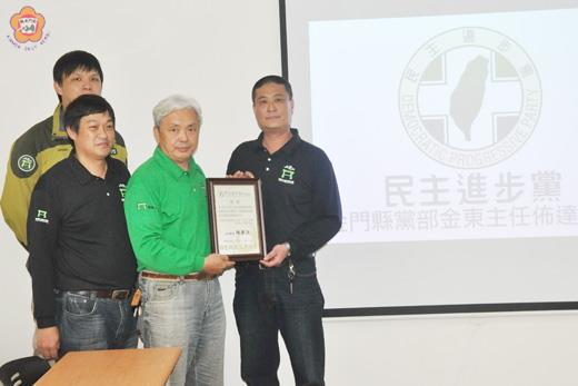 民進黨金門縣黨部昨舉行金東區服務處新任主任張礽裕佈達儀式,主持典禮的縣黨部主委陳滄江也希望藉助張礽裕同志的到職,進一步拓展黨部更大的服務層面,平衡金門東西區的服務。 佈達典禮昨日下午四時三十分在民進黨金門縣黨部舉行,由縣黨部主任委員陳滄江議員主持,黨職人員包括全國黨代表、縣黨部執行長洪海水、陳滄江議員服務處主任許仲雄以及執評委員等人在場觀禮。 陳滄江主委表示,民進黨中央黨部非常重視金門地區的服務,二月份他參加中央的主委會議,親自向蘇貞昌主席建議增設金門東區服務處主任的構想,獲得蘇主席的同意。 他表示,有競爭才有進步,良性的政黨競合關係才能為金門鄉親爭取最大值的利益,民進黨雖然在金門是在野的小政黨,但是民進黨金門縣黨部是一個有志氣的政黨,服務品質絕對不會輸給國民黨,舉凡土地權益、環境保護議題、勞資衝突處理、醫療糾紛、貧困慰問、急難救助及喪葬補助等社會服務,皆有顯著成果,相信鄉親應該有目共睹,目前與議員服務處合署辦公的小板凳工坊,有六位專職的黨工及助理群,每天都全天候為鄉親提供多元化的服務。 他表示,張礽裕同志將是第七位專職黨工職人員,張礽裕主任目前是計程車協會常務理事及金湖、金沙義交分隊長,平日對地方事務服務熱心,致力推廣地方黨務不遺餘力,也希望借助他的到職,拓展黨部更大的服務層面,同時也能平衡該黨對金門東西區的服務。 陳滄江表示,金門地區需要有不同的聲音,不同的民意,這些年來有民進黨的努力才能觸動國民黨的改革,對鄉親絕對是正面的。