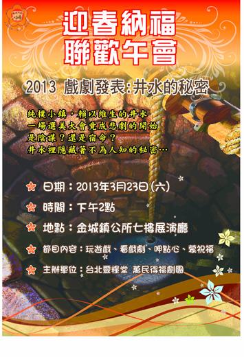 免費好戲登場、歡迎民眾觀賞!萬民得福劇團即將於本周六抵金進行表演,該團歡迎地區民眾偕家人到場觀賞,戲劇演出完全免費入場,喜好戲劇表演的朋友別錯過這個看戲好機會! 由台北靈糧堂所組成「萬民得福劇團」,將在三月二十三日本週六下午二時,於金城鎮公所七樓展演廳舉辦「迎春納福聯歡午會」,會中將透過聯歡會與金門鄉親分享基督徒認為最寶貴的福氣。除了安排精采的戲劇發表外,還有互動遊戲、歌舞表演、福音解籤等活動與金門的鄉親同歡,會中還準備豐富的午茶點心,節目安排老少咸宜,全程免費,提早入場以免向隅。歡迎金門鄉親攜家帶眷蒞臨,全家一起歡渡快樂週末。