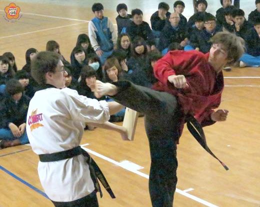 黑帶八段的空手道「教士」布萊恩昨天在金門農工表演徒手擊打鐵釘刺入厚木板的拳技,以及飛踢、旋踢等足技。布萊恩是想透過空手道的示範,以及對「COMBAT」(戰鬥)這個關鍵字的拆解,告訴學生們如何以信心和勇氣,克服生活中的困難,面對挑戰,選擇正途,永不放棄! 以美國「戰鬥劇團」和「武術劇團」為名,布萊恩與黑帶三段的鮑帝聞、褐帶二級的安娜、黑帶一段的耶書亞等,昨天在金門農工表演空手道。他說,學空手道可以健身,可以修養品格,而且很有趣。 其中,鮑帝聞在金門已經旅居多年,最初是參加金車教育基金會的「英語史懷哲計畫」,在金門教英語,後來又離開金門進修,然後再重返金門,並在金門娶了同樣是參加史懷哲計畫的女友為妻。鮑帝聞在金城國中體育館免費教空手道已經兩年,現在還在招生中。 昨天的表演,由布萊恩擔任解說,由安娜、耶書亞、鮑帝聞和布萊恩自己進行示範。除了用足技、手技讓人嘆服之外,布萊恩還旁白了許多具有教育性、勵志性的話語,並透過金城教會的師母詹秋足(牧師李坤南的妻子)翻譯。 當布萊恩飛過三個人踢破木板前,他一身是戲,故意製造緊張及趣點,想讓趴在地上的三個學生小小緊張一下;鮑帝聞矇眼表演足技時,也是先耍寶搞笑一番,再展現真功夫。 布萊恩還致贈了附帶照片的個人小傳給每一個學生;由小傳中可知,他五歲時,家庭破碎,父母離異;十四歲時,他有了新爸爸和新名字,並得到了照顧;後來,主耶穌成了他的天父-他感謝天父救了他,並邀請天父進入他的生命。 目前是空手道褐帶二級的安娜,六年前參加進級時,雖然事前一練再練,苦練不輟,還是在擊肘時失敗;她原本很痛苦,後來卻學會了不怕難,不放棄,繼續接受挑戰;當再次接受挑戰時,她已經克服心理障礙,不害怕會再度失敗-認為即使失敗了也沒關係;不過,她成功了!今年夏天,她將再接受挑戰,希望能夠更進一級。 今年夏天,鮑帝聞的空手道老師史考特·莫瑞將會來到金門;鮑帝聞正計畫要舉辦一個空手道夏令營。 史考特·莫瑞是黑帶七段的空手道教士(達士),免費教人學習空手道已經二十年;鮑帝聞就是受到他的影響,免費教六年級以上的學生學習空手道,時間為每週一到週四晚上六點半起,地點在金城國中體育館。他在招生傳單留下的電話是0975669442。 婚後的鮑帝聞,至少還會在金門住五年,他正在尋找平價的住所-金門房價的飆漲,讓他覺得頗有壓力。他表示,除非上帝對他有其他計畫;否則,他自己非常喜歡一直留在金門,至少會再待五年以上-至少要能夠把跟著他學空手道的學生們,帶到一定的程度!