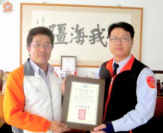文/張建騰‧圖/岸巡總隊 金門縣遊艇協會昨致贈感謝狀給金門岸巡總隊船艇維保組,原因是每當所屬船艇發生機械故障時,金門岸巡總隊船艇維保組都會予以協助修復及技術支援。 感謝狀昨日是由總幹事吳振城(左)代表金門縣遊艇協會致送,並由副總隊長郭偉恭(右)代表金門岸巡總隊接受。