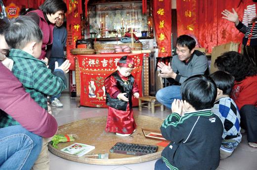 做周歲是地區代代相傳的重要生命禮俗,伴隨社會發展已漸被遺忘。日昨家住信義新村的鄭輪,為他的孫子鄭立松做「度晬」。外婆為外孫準備「頭尾」,壽星穿著長袍、馬褂、碗帽加金飾等標準配備,踏過代表長壽的紅色麵龜,坐在竹篩內抓周,吸引許多親朋好友祝賀及圍觀。鄭輪說,孫子共抓了雞蛋、印章、銀元、蔥等五、六樣物品,大人小孩都開心,而抓周不只是重要的慶生禮俗,也是人生第一次的性向測驗,非常有意義。 地區流傳許多代代相守的生命禮俗,從媽媽懷孕開始,即有禁看傀儡戲等懷孕禁忌,在小孩出生後,有拜床母等習俗,媽媽則在生產後需坐月子。新生兒出生後做十二日、落胎髮、滿月及四個月收涎等乃至周歲,都被視為重要的人生禮俗之一。 周歲,俗稱「度晬」,也是老祖宗流傳下來的生活智慧,在新生兒滿周歲這一天為其測試日後的發展。在早期傳統社會中,會幫男孩舉辦抓周大典,伴隨社會的進步及發展,為女兒舉辦抓周大典已大有人在。談到抓周,在工商社會中已逐漸式微,故去年安瀾國小配合課程,把抓周大典搬到學校,成了最珍貴的活教材,薪傳這項傳統禮俗。 自古流傳迄今的抓周儀式,有必備的十二樣物品,不論隨時代轉變是否用計算機或電腦取代算盤,或以美金、新台幣以及支票取代銀元等,這些物品和儀式象徵代代流傳、相守的生活智慧,也是大人對孩子的期盼。根據鄭輪、太太何翠旋表示,共準備蔥、芹菜、筆、紙、硯、書、秤、算盤、銀元、雞腿、紅雞蛋、印章等十二樣物品。而在抓周之前,還有拜拜儀式,家裡大大小小、內內外外張羅,孫子的外婆家也準備「頭尾」等一起參加抓周大典,十分熱鬧。 據悉,外婆家為外孫做周歲準備「頭尾」件數不論多少,代表從頭到尾都俱全,長袍、馬褂、碗帽、鞋、襪、衣服、金飾等都是標準配備,也是壽星抓周的基本造型。 壽星鄭立松,穿長袍、馬褂、頭戴碗帽,全身戴滿金飾,金光閃閃歡歡喜喜,在爸爸鄭榮璋的協助下,雙腳踩過代表長壽的紅色麵龜,開始坐在竹篩內抓周。他毫不猶豫拿了紅蛋、印章,也摸了蔥、芹菜,他東張西望巡視所有物品,在現場眾多親友你一言我一語比他還緊張,十分有趣。最後他笑嘻嘻地則是把玩銀元,也為人生中第一個生日慶典畫下圓滿句點。 鄭輪說,抓周是新生兒滿周歲慶生禮俗,非常重要且別具意義,所以在孫子周歲時為他做周歲舉辦抓周。這除了是代代相傳的生命禮俗外,從科學的角度更是人生第一次的性向測驗,必備的物品樣樣都具有殷切的期盼和吉祥之意,不論孩子選了什麼,壽星媽媽蔡怡萱說她都很開心。
