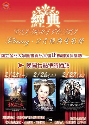 金大圖書館「2月經典電影節」年後首波強打,挑選出「金陵十三釵」、「鐵娘子」、「公主與狩獵者」等三部影片,金大歡迎大家相約逗陣來,一同找尋撼動人心的旅程。民眾若有相關問題可於上班時間來電洽詢,圖書館楊小姐:082-313386。 金大指出,「2月經典電影節」,於昨(25)日起至2月27日晚間7時在圖書館1樓楊肅斌演講廳輪番播出,播映場次如下:昨日「金陵十三釵」;2月26日「鐵娘子」;2月27日「公主與狩獵者」。 金大指出,「金陵十三釵」,由導演張藝謀執導亦為唯一入圍金球獎最佳外語片的影片,將帶您回到彷彿身處其境中國的1937年代,以平凡的靈魂成就一段撼動人心的故事。「鐵娘子」,則以柴契爾夫人為影片主角,電影中以倒敘手法回顧柴契爾夫人的傳奇一生,揭開政治人物背後的落寞和曾經付出的代價,感性呈現這位不凡女性剛柔並濟的面貌與不為人知的一面。「公主與狩獵者」,是經典童話「白雪公主」改編的,由天才製片喬羅斯和廣告鬼才兼視覺大師魯伯特桑德司聯手打造成一段亡命之旅並發展出愛情的黑暗版魔幻故事。