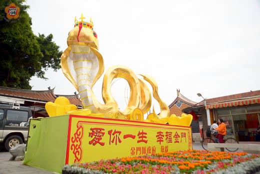 二○一三年金蛇年元宵燈會將於明(二十四)日於金門鎮總兵署盛大登場,蛇年主燈(見左圖/董森堡攝)目前安置完成,並將在明日由金門縣長李沃士主持點燈儀式,為燈會拉開序幕,目前各式花燈布置正緊鑼密鼓進行中,並已近完成,金門縣文化局歡迎地區民眾於明日晚間共襄盛舉,一同慶元宵。 金蛇年元宵燈會今年以「愛你一生,幸福金門」為主題,重現「走馬燈」和「射燈謎」古風,文化局同時邀請台灣、金門、大陸文化界一起參與謎題設計,燈會現場還安排藝文團體表演。 文化局表示,主燈安置在總兵署前廣場,長度約五公尺,寬度約二點五公尺,高度約三點七公尺,以「2013,蛇年」為設計元素,透過「金蛇王」的卡通化立體意象,展現過年賀歲的溫馨喜慶氣息,祝福鄉親未來一年添金添福攜手同心,以愛來打造幸福金門。此外於總兵署兩側還有兩座以擬人化的「靈蛇小王爺」和「金蛇小王子」造型花燈,搭配風獅爺、得月樓、莒光樓等金門元素意象燈組,傳達「點亮浯島,魅力金門」的主題。文化局說,元宵燈會於二月二十四日起至二十八日止,假總兵署一連展出五天。二○一三年蛇年主燈目前已在總兵署廣場設置完成,將於明日晚間點亮。此外展場還有規劃金門各公部門、各級學校和民間單位共襄盛舉所設計的花燈參展作品,分為主燈、中型花燈、小型花燈等三區,歡迎民眾攜家帶眷一同前往觀賞。 點燈儀式於元宵節當日晚間六時三十分,於總兵署前廣場開幕,邀請縣長李沃士主持點亮主燈,並於七時起由中正國小提燈踩街遊行隊伍將繞行後浦地區,活動內容包括有,元宵花燈會、提燈遊行、元宵燈謎會、元宵晚會。