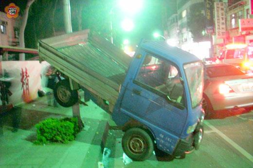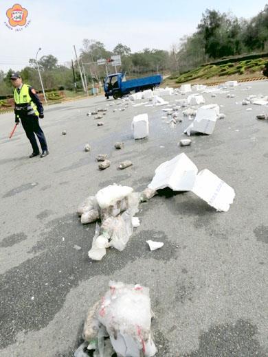 小貨車,大滾翻!一部滿載蚵仔的「3.49噸型」小貨車,昨天上午行經瓊義路、經武路、環島南路十字路口時不明原因失控,車頭帶車尾橫著翻滾了兩圈,約一千八百公斤的蚵仔外帶保麗龍及冰塊,散落在十字路口,駕駛人看起來沒事。 據小貨車的駕駛人描述,他從新頭漁港載著三十六箱蚵仔要到水試所銷毀,每箱約五十公斤-分成小包裝;箱上有海關的封條。他駕車由金湖鎮走經武路往金城,車子卻在瓊義路、經武路、環島南路十字路口翻滾-但是他自己也搞不清楚到底出了什麼問題。 事發後,警方獲報前往維持交通,並知會環保局協同處理。在小貨車駕駛沒事的情況下,十字路口的冰塊、蚵仔和保麗龍,卻成了其他車輛的障礙與險阻;不過,還是有駕駛人沒有遵守警察的指揮,被警察大聲制止危險的行動。 這部翻了兩滾之後的小貨車,最後仍能四輪在地,駕駛人看起來也沒有受傷,令人嘖嘖稱奇,大呼幸運。