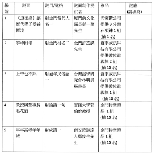 二○一三金門元宵燈節即將盛大登場,一項由金門縣文化局主辦,本報、台灣謎學研究會等單位協辦的「紙上燈謎會」活動,將於今(十八)日起率先登場。自今日起一連六天,每天於本報刊登五則謎題,歡迎民眾踴躍參加解謎,豐富的獎品將於元宵節燈謎晚會上現場抽出。 元宵節「紙上燈謎會」,自二月十八日起至二十三日止,每日各有五則不同的謎題刊登於金門日報。請民眾依編號謎面、謎目和謎格,分別填寫上謎底答案。每張明信片限貼一題,請自行從金門日報版面剪下貼上,並註明答題者的姓名、聯絡地址和聯繫電話或手機。貼好的明信片郵寄至「金門郵政第106號信箱,2013金門元宵紙上燈謎會收」。 主辦單位表示,活動將有鑽石項鍊、數位電視棒、金門特產禮盒等數十項獎品,各獎將於元宵節當天燈謎晚會上抽出。獲獎方式,若名額為一名,且只有一人答對時,該獎品由答對者獨得,若有多人答對,以抽籤方式抽出決定。若獲獎名額有十名,以抽籤方式抽出十名答對的獲獎者。