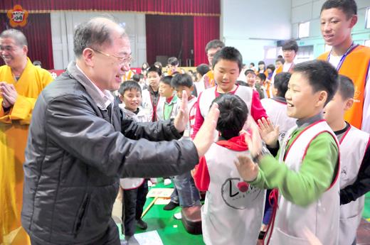 「一○二年大能精舍快樂行兒童成長冬令營」首次在金門舉辦,首日活動於昨日上午在金城國中體育館盛大展開,兩百多位國小學童共襄盛舉,報名參加。金門縣長李沃士於昨(一)日下午,特地前往關心小朋友們學習狀況,並致贈紅包福袋。 縣長李沃士昨下午四時三十分許,在隨行人員陪同下,前往金城國中體育館,向參加成長營的兩百一十位學童拜早年,並了解孩子們首日的學習情形。受到金門縣佛教會常務監事長性海法師、大能精舍湛因法師及佛教會理事黃克標等人的熱烈歡迎。 李沃士致詞時表示,今年寒假較長,因此佛教會能夠舉辦這個有意義的活動,讓孩子在漫漫長假能有繼續學習的管道。而學校的學習,老師們所帶給小朋友的是知識上的增長,但除此之外,有很多領域,如生活、道德、品格倫理等領域,都是需要學習的,很多人在學識上很廣博,但在道德層面卻是缺乏,以致道德淪喪,犯罪叢生,因此他相當感謝性海法師及湛因法師,舉辦這樣陶冶品格的活動。 縣長李沃士於昨下午前往城中體育館,受到所有人熱烈歡迎,在簡短致詞後,更一一發送紅包福袋向在場所有學童拜年,並希望他們三天活動收穫滿滿。