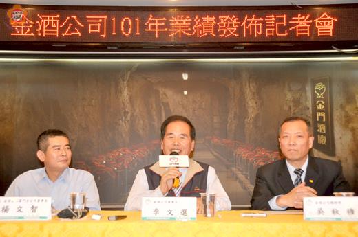 金酒公司營業額突破歷史新高─101年度營業收入總共達160億餘元(其中廈門分公司9.12億)。董事長李文選昨主持「金酒公司年度業績發佈記者會」時強調,這份榮耀歸功於全體員工及金門鄉親所有,未來將持續努力打拚,以建設金門、福利鄉親。 迎接建國102年的到來,金酒公司檢討過去、以展望未來。昨下午召開「金酒公司年度業績發佈記者會」,董事長李文選、總經理吳秋穆、金酒公司廈門分公司董事長楊文智親自上火線說明過去一年的營運成果。 總經理吳秋穆指出,101年度營業收入總共達151.16億元,突破歷史新高。101年度挹注縣庫64.5億元,創歷史新高,比100年多挹注14.5億元,比年度預算多44.94%。俟稅後還會挹注入縣庫,預估可挹注入總數70億元。 廈門分公司董事長楊文智說明,廈門分公司營業額101年度營收總共達9.12億元。突破歷史新高。 整個公司合併營收達160.28億元,較100年度合併營收136.02億元,增加24.26億元,成長17.83%,締造歷史新高。101年報繳中央菸酒稅共計33.39億元。 金酒公司去年營業額創傲人佳績,據吳秋穆表示,主要關鍵在兩岸交流頻繁,陸客對金門高粱酒認同、以及免稅商店進駐。其次,縣府結合金酒、特產共同推介行銷金酒。再則金酒公司因應巿場需求不斷推出新產品。 值得一提的是,開發具有文創價值紀念酒,前年有20款、去年達30款之多。如與中正紀念堂合作紀念酒、圓山飯店紀念酒等等設計,吳秋穆強調,金酒公司賣好酒,也結合文化歷史賦予金酒新生命。 對記者提問有關配售卡(菸酒牌)議題,吳秋穆說明,前年有8千多張,截至目前為止已突破1萬4千大關,且配售率達百分之百。吳秋穆表示,配售卡非責任制、是公告制,金酒公司研擬儲酒計畫期能賣更好的酒。 談及民間製酒廠廣告涉及金門酒廠、金門高粱商標部份。吳秋穆強調,金門酒廠、金門高粱商標早已註冊,是屬於全民共有,全民應共同愛護捍衛。針對侵權者業已搜證採取法律途徑進行訴訟中。 吳秋穆也說明,前年免稅店營業額達4億元、去年受合約限制營業額也達4億元,其每月均有銷售報表,均照合約履約。金酒公司金城廠增加第3生產線,預定明年第一季可以加入投產,以提升產能。 針對廈門分公司營運業績,董事長楊文智指出,去年營業額較前年增加百分之19,但利潤只成長百分之3(盈餘3千6百萬人民幣)。主要廣告行銷費增加、另新酒品未銷售等因素有關。 有關金門地區批售業者反映,金酒公司獨厚財團而不照顧金門地區批售業者之誤解,吳秋穆特提出澄清說明如下: 金酒公司供銷金門地區批售業者的酒基公升數(折合60度酒)從97年至101年近5年逐年大幅增加,為增加供應而非減少供應;供銷38度、58度金門高粱酒台灣地區總經銷商的酒基公升數近幾年皆管控在合約量的最低限額下,詳細數據資料如下: 寧山配銷處97年403萬6,153公升、98年361萬9,848公升、99年463萬4,987公升、100年622萬1,120公升、101年690萬6,751公升。 金門地區家戶配售酒97年282萬3,370公升、98年155萬6,563公升、99年237萬6,384公升、100年268萬4,142公升、101年279萬1,711公升。 58度經銷商97年956萬9,856公升、98年959萬7,960公升、99年845萬1,268公升、100年839萬1,547公升、101年936萬0,170公升。 38度經銷商97年349萬2,544公升、98年333萬4,831公升、99年350萬3,374公升、100年264萬9,746公升、101年295萬2,316公升。 吳秋穆表示,從上述供銷金門地區批售商戶與58度金門高粱酒台灣地區的酒基公升數做比較,金酒公司對金門地區批售商戶是比較照顧的,並非金門地區批售商戶所陳述金酒公司比較獨厚財團。 吳秋穆也表示,金酒公司在全體同仁戮力經營之下,不負縣府交付任務,績效再創歷史新高。他強調,這份績效並非一人功勞,而是全體員工、鄉親支持下,讓金酒續創歷史新高。