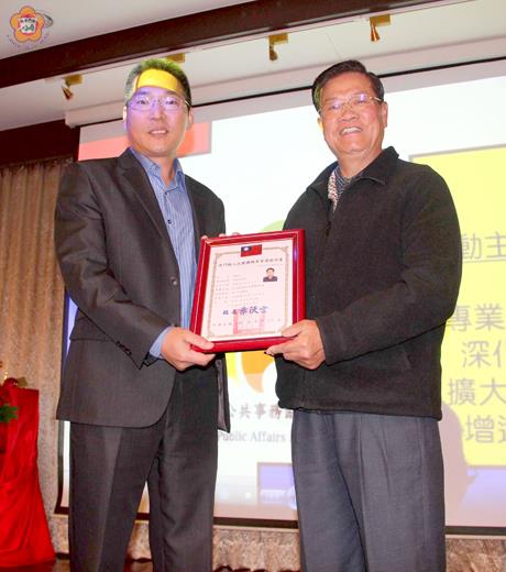 金門縣湖峰公共事務協進會辦理第二屆會長暨理監事授證典禮昨日晚間假盈春閣餐廳舉行,省府前主席顏忠誠頒發會長當選證書予楊萬山,正式帶領湖峰會邁向第二屆,楊萬山特別揭櫫未來的工作方針「專業分享、深化公益,擴大參與、增進交流」,期望以會員的專業來推動社區服務,積極推動社團交流,讓湖峰會能夠學習成長以深化公益服務,讓會務更能健全發展。 湖峰公共事務協進會昨日晚間六時三十分假盈春閣餐廳舉行第二屆會長暨理監事授證典禮,儀式由省府前主席顏忠誠頒發會長當選證書,觀禮祝福貴賓有立法委員楊應雄、縣府秘書長盧志輝、退休省府組長楊誠璽、金寧鄉長陳成勇、金城鎮長石兆瑉、金城鎮民代表會主席陳天成、中華電信金門營業處經理姜世榮、金門縣商會總幹事楊清沃等嘉賓。 昨日接受頒證的理事有:楊肅藝、楊榮財、楊忠俊、賴盈璋、楊宏文、楊福建、翁健文、李雅蘭、楊漢中、洪茂榮、陳錫達、楊天生、馬自壯,候補理事楊恭文;監事有:楊志中、方駿洋、楊恭橋、楊肅偉,候補監事周祥文。並敦聘湖峰楊氏宗親會理事長楊永立及楊誠璽為該會第二屆榮譽會長,消基會執行董事黃怡騰、金門縣商會總幹事楊清沃、金門信用合作社理事主席陳松泉、長庚林小兒科主治醫師林江水為榮譽顧問。