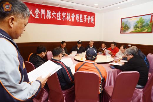 聯繫宗親情誼、綜理六桂會務,社團法人金門縣六桂宗親會昨天假盈春閣餐廳舉行一○二年度第一次理監事會議,會中除審核六桂宗親會暨洪怡祥獎學金名冊外,並探討今年度六桂宗親春祭祭祖大典等相關事宜,身兼六桂宗親會理事長的社會處長方天吉期許在眾人的努力下,六桂宗親枝繁葉茂、會務能蒸蒸日上。 這場理監事會議是在昨天早上十時許於盈春閣餐廳舉行,由六桂宗親會理事長方天吉主持,與會人員包該宗親會理監事等人,會中除進行會務報告、上次會議決議事項外,同時順利審議通過「一○二年申請金門縣六桂宗親會暨洪怡祥獎學金名冊」、「一○二年工作計劃」、「一○一年會務經費決算」、「一○二年會務經費預算」及「辦理一○二年春祭祭祖大典」等提案。 理事長方天吉在會中表示,六桂宗親會致力於六姓宗親的聯誼交流,除了現行的業務外,該會預計在今年發行會刊,邀集宗親會內的菁英主筆,透過文章及照片的呈現,表達六桂宗親團結一致、血濃於水的感情。另外,該會亦將慎重處理今年度春祭祭祖之事典,期望能留給後輩子孫最正統的倫理教育。 方天吉期許六桂宗親共同推動會務,傳續飲水思源、慎終追遠的觀念,互助合作、共存共榮。會後,理監事人員並於盈春閣進行聯誼餐敘、暢論會務事宜。