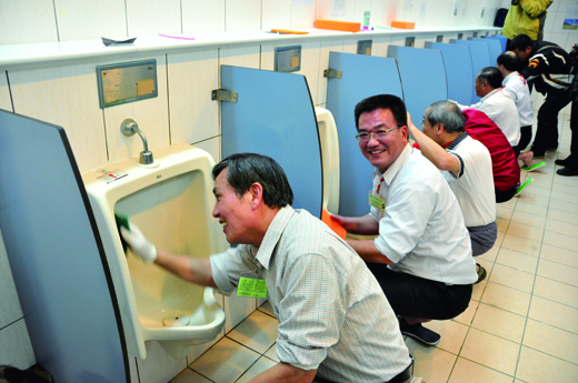 為讓地區主官、主管學習謙卑,放下身段。金門縣環境保護局昨日辦理一場「一○二年金門縣清掃學習實做活動教育訓練」,環保局長楊世宏邀集中正國小校長張木百樾、賢庵國小校長陳為信等地區各單位學校的主官、主管參加,挽起袖子,拿著刷子俯身清掃廁所,體驗感受不同的學習刺激。 「清掃學習」源自日本,始於鍵山秀三郎發起,藉由清掃學習活動,讓國人在日常生活中,學習以最簡單及隨手可得的工具,主動清掃環境。而主管階層也能藉此體驗「放下身段」、「謙卑學習」、「凡事澈底」、「磨練心志」、「感恩惜福」、「體恤辛勞」及「環境為本」的清掃哲理,愛護賴以維生的生活環境,落實「環保新生活」。 這項由環保局主辦,金門大學協辦,台灣環保生活協會執行的「清掃學習實做活動教育訓練」,是於昨日下午一時三十分起,在金門大學陳開蓉會議廳及圖資大樓男女廁所舉行。邀請縣府局、處、室、中央駐金單位、各級學校校長等主官、主管與會參加。 環保局長楊世宏表示,環境整潔須賴眾人維護,而「清掃學習」不但是一個提倡整潔的好辦法外,更能讓人在打掃過程中,學會諸多哲理,是相當有意義的活動。此外金門目前列管的公廁有一百三十一間之多,其中評分達八十五分以上的優等公廁就有八十五間,表現相當優異。他也希望藉此活動,讓主管體驗不一樣的學習,並將之落實在生活細節中。