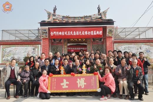 烈嶼鄉東坑呂氏家廟在新年初始,為傑出的宗族子弟呂允在熱鬧舉辦博士晉匾的宗族喜事,烈嶼鄉長洪成發、地方各界與呂氏宗親一同分享呂允在學業有成、服務社會的榮耀。鄉長洪成發讚揚呂允在義務投入旅台鄉親以及母鄉服務工作的精神,成為一個典範,激勵更多有所成就的鄉親,也能從事志願服務,回饋家鄉。 現任國立台灣藝術大學圖書館採編組組長的呂允在,不斷進修,於多年前取得中國文化大學史學研究所的博士,長年來,利用公餘時間投入烈嶼公共事務協會的服務鄉親工作,也一直關心母鄉的公共事務,還以他的專業和豐富的史學學問,協助鄉公所修纂鄉誌,並為東坑社區規劃文化活動,提出社區總體營造的計畫案,也出版「飲水思源-盡看東坑容顏」一系列的叢書,包括,追本溯源-盡攬東坑風華、東坑呂氏家廟族譜、六姓宗祠族譜、清雲祖師廟源流考全紀錄、典藏東坑-烈嶼歲月憶往、細說烽火話烈嶼-從東坑談起,為烈嶼和地方留下很多珍貴的文化史料,貢獻良多。 東坑社區居民很稱讚呂允在奉獻社區的精神,呂氏宗族也以呂允在為榮,在宗長呂合成的提議下,宗族依鄉俗為呂允在舉行晉匾儀式,讓呂允在有一點受寵若驚,更感責任的加重。呂允在的親大哥孫允理、同窗好友的烈嶼公共事務協會會長孫國欽、亦師亦友的台藝大教師黃世團、歐陽彥興等好友陪同他返鄉,感謝母鄉長輩和親朋好友、宗親的熱情和厚愛。 獻匾祭典於昨日上午十時五十分舉行,鄉長洪成發帶領鄉公所主管幹部、鄉代會主席洪若珊、副主席蔡金爵、鄉代表方水萬、吳福全、洪鴻斌、林長征、以及烈嶼指揮部副指揮官賴炯良、政戰主任羅俊宏、上岐國小校長黃明森、西口國小校長楊肅健、和呂允在昔日的校長林水綠、恩師洪永善、金門縣政府烈嶼服務中心主任林宜蘭、國民黨烈嶼鄉黨部主任蔡弼光以及宗親、親朋好友、同窗好友共聚在呂氏宗祠,各界和宗族的重視,讓呂允在很感動,滿滿感受到地方濃濃的鄉情。 呂允在遵循古禮上香祭拜歷代祖先,並獻上大紅匾額,虔誠感懷祖德福蔭子孫。呂允在說,他年少好玩,不愛讀冊,隨著到台灣工作所面臨的競爭環境,讓他感受到讀冊的重要性,陸續完成大專、碩士、和博士的各階段學涯。呂允在說,他心中謹記父親的教悔,父親希望兒女們留一個好名聲,讓他有勇氣到宗祠內晉獻匾額,也感到今後更要竭盡所能來服務母鄉和宗親。 鄉長洪成發說,呂允在印證了只要肯努力上進,一定會出人頭地,更難得的是他這一份無私的奉獻精神,為後輩樹立學習的模範。他希望有更多鄉親也能如同呂允在一樣的為家鄉付出一分關心的力量。 昔日恩師林水綠、洪永善也以呂允在的優秀表現為榮。林水綠說,只要肯學習,輸在起跑點不要緊,終點的成就才是最重要,行行出狀元。 洪若珊、孫國欽、黃世團等人也表達祝福。來金服務的烈嶼指揮部副指揮官賴炯良也感受金門地方重視宗族子孫「光宗耀祖」的傳統美德。