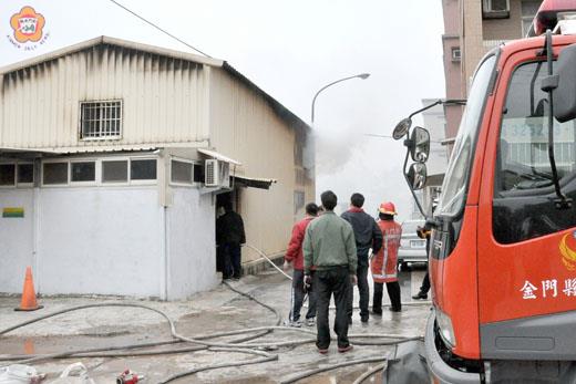 金城富康一村一處鐵皮屋昨日上午發生火警﹐現場濃煙密佈﹐火舌竄出﹐消防局出動消防車十一車次及四﹑五十位打火弟兄趕抵灌救﹐迅速將火勢撲滅﹐現場燒得焦黑一片﹐並無人員受傷。詳細起火原因正由消防局火調課進一步調查。 金城鎮富康一村九巷一號鐵皮屋昨日早上發生火警﹐由於空間較為密閉﹐火舌濃煙不斷竄出﹐煙霧順著風向金城警分局方向飄散﹐民眾見狀﹐連忙撥打「一一九」報案。 消防局勤指中心於十時三十四分接獲報案後﹐第一大隊立即出動轄區金城﹑金寧分隊消防十一車次﹐動員職消﹑義消四﹑五十人到場進行灌救。消防人員到達現場後只見一片火舌﹑濃煙不斷竄出﹐打火弟兄立即部署水線﹐從正面﹑側面進行搶救﹐於火災現場發現有一顆使用的瓦斯鋼瓶﹐立馬將其搬離現場﹐以確保不會發生引爆情形。 消防局長楊肅凱﹑副局長王世祿獲悉後也趕抵現場指揮搶救工作。 消防局指出﹐由於火警發生時民眾報案資訊並不是很完整﹐只是說在富康一村發生火警﹐有大量濃煙竄出﹐消防局指揮中心還是比照住宅火警立即啟動大隊救災模式﹐派遣金城﹑金寧消防車與人員趕抵現場救災。經過消防人員入內搶救﹐火勢在十一時零九分獲得控制﹐十一時十三分將火勢撲滅。 起火的鐵皮屋為金城新莊﹑富康一村社區健康營造中心及金城鎮代表李玉葉服務處﹐由於起火的鐵皮屋是二層樓的隔間﹐空間較為密閉﹐裡面堆放雜物﹐火勢相當猛烈﹐鐵皮屋旁停車場一輛緊鄰鐵皮屋的轎車板金因為高溫而烤漆脫落﹐車主也趕緊將車子開離現場﹐以免遭火舌吞噬。 金城鎮代表李玉葉指出﹐起火的屋子是她的服務處及社區營造中心﹐平日作為社區辦活動與大家共聚的場所﹐一場火將裡面的東西全毀﹐建築物也幾乎全毀﹐還要勞民動眾來協助搶救。 昨日火災現場附近還有家瓦斯行﹐附近空地也堆放許多瓦斯空瓶﹐由於空瓶仍會殘留氣體﹐民眾也曾反映居住安全問題﹐要求撤走﹐消防人員說﹐依規定不能超過一百二十公斤即六個瓦斯瓶﹐否則就要送到合格的瓦斯儲存場存放﹐據消防局實際查訪﹐附近空地堆放的都是待換修﹑補漆的瓦斯空瓶﹐消防局也定期加強巡查﹐以維護民眾居家安全。