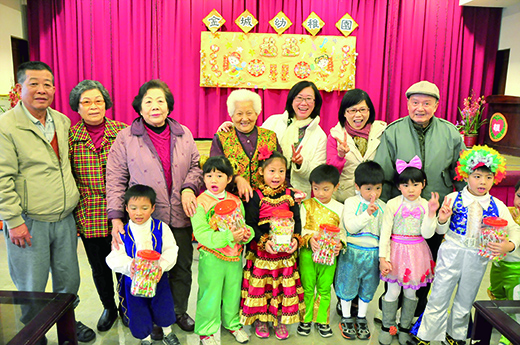 歲末寒冬,年關將近,金城幼兒園大班幼生昨(十四)日前往大同之家散播歡樂,賀歲新年,以熱歌勁舞向大同之家的長輩們賀年。而城幼幼生們的歡笑聲及活力,也讓家內長輩個個是眉開眼笑,城幼並還準備糖果分送老人們,讓他們吃的甜蜜在嘴中,溫暖在心中。 金城幼兒園於昨日上午十時許,在幼兒園園長盧淑惠及教師們的帶領下,該園大紫、大藍、大粉紅、大紅、大彩虹、大綠等班級幼生,共兩百餘學生,前往大同之家演出,將其平日學習成效展演給長輩們欣賞。活潑表演受到家內長輩及大同之家主任許美鳳的熱烈歡迎。 園長盧淑惠表示,這項表演活動,是該園社區服務的落實,幼生們將他們平日學習成果,透過唱唱跳跳的表演方式,讓大同之家的長輩感受歡樂氣氛。由於表演正是孩子們平日學習,故而不需特別排練,演出也更為自然生動。而選擇至大同之家表演,另一層面也是教導孩子尊敬長輩的美德,不只是對自己的父母至親,只要是年長長輩都需要敬重的傳統倫理觀念。 幼生的動感演出,獲得長輩一致好評,許美鳳指出,幼生們是爸媽們的寶貝,而長輩們則是所有人的寶貝,兩個寶貝齊聚一堂,令她備感溫馨。她也感謝幼兒園能夠安排這樣的表演活動,讓長輩們在年關將近之際,感到相當窩心。 賀歲新年表演約進行一小時,首先由大紫斑以「愛你的只有一個我」動感舞曲拉開序幕,大藍斑的歡樂律動炒熱現場氣氛,緊接著歡樂變奏曲、卡門變奏曲及加加油等歌舞表演,讓台下長輩看得拍手稱讚,最後在大綠班以應景的賀新年結尾。表演過程中,盧淑惠更一一分送糖果,恭祝長輩新年快樂,而許美鳳則代表大同之家,回贈糖果。