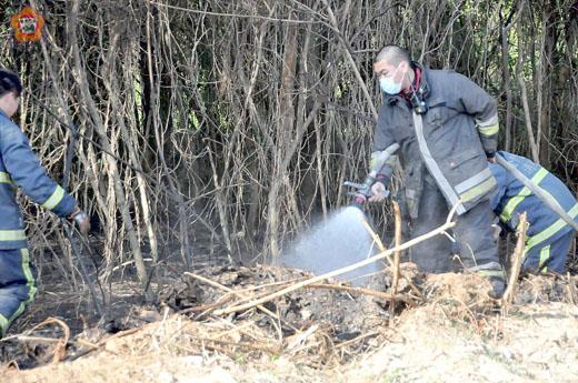 金沙鎮田埔水庫西側五百公尺處,昨日發生田野火警,火點鄰近一荒廢旅館建築,由於距離水源遠,消防車輛無法入內,金沙、金湖職、義消以背負式水袋深入火場,並且在金東守備隊三十位官兵人力支援下,有效阻絕火勢。所幸無人員傷亡,也未危及附近珍貴林木資源。 金沙消防分隊表示,昨日上午十一時許接獲勤指中心轉報田埔水庫附近發生田野火警,立即動員人車前往查看,由於火勢有擴大之虞故請求加派人車支援,金沙、金湖職、義消動員十一人,五車輛到場搶救。 根據消防人員表示,火警地點距田埔水庫四、五百公尺西側空地,火點為一荒廢旅館,不易深入火點,為避免風勢強勁,助長火勢,引起類似前年田埔林區火警,故隨即向軍方請求支援,金東守備隊由隊長蕭光龍率領三十位官兵弟兄,於十二點五十七分抵達現場前往支援。 而由於車輛無法進入,職義消人員,以背負式水袋深入火場,並且佈設兩條水帶,十多條水帶分南、北兩線,一方面攻擊火勢,另一方面則阻絕火勢,避免蔓延開來。金東守備隊三十位官兵到場配合消防人員徒手拍火、圓鍬做殘火處理,軍民合作順利於三點將火勢控制住,歷時四小時解除危機,初估燃燒面積約五百平方公尺,所幸搶救及時未危及附近珍貴林木資源。 金沙消防分隊分隊長董紀瑋表示,根據消防局統計,近幾年火警案件有九成為林地雜草火警,常讓消防員疲於奔命。 故自一百年起消防局局長楊肅凱特別針對如何減少山林田野火警與軍方建立支援網絡,除平時固定召開聯繫會報,亦加強各項訓練工作,於災害發生時於最短時間加入搶救行列,有效降低災害損失。金沙消防分隊呼籲民眾,勿隨便亂丟菸蒂,勿隨意燃燒雜草,以防引發山林田野火警,造成林木資源耗損。