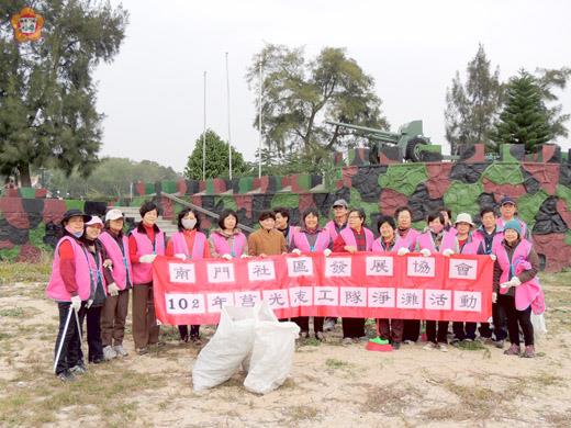 響應環保,維護社區家園的環境整潔。金城鎮南門社區發展協會│莒光志工隊,於日昨下午在理事長李永金的帶領下,進行南門社區以及雄獅堡周邊海濱的環境清潔及淨灘活動,共同為地區環境盡一己之力。 南門社區發展協會,於日昨下午一時三十分許,在李永金、南門志工隊長薛憶雯、副隊長許淑慧、莊麗芬等人的帶領下,自佛光山金蓮淨苑至雄獅堡,進行掃街活動,維護社區周遭的整齊,同時並前往該社區所認養的雄獅堡周邊海灘進行淨灘。該社區有莒光志工隊的成員,不分男女老少,個個認真的拿起掃把,沿途清掃路邊垃圾,並俯身撿拾海灘垃圾,讓海灘回復風采。 該社區莒光志工隊隊長薛憶雯表示,南門社區是金門地區人口眾多的區域之一,該社區周邊道路更是每天車水馬龍,過往行人相當頻繁,因此對於整體環境清潔更需積極清掃。而該社區所認養的雄獅堡海灘,也是金城地區民眾飯後散步遊憩的場所,或是觀光遊客會造訪的地點,因此維護環境整潔不只是帶給遊客乾淨美麗的景點,更是能讓地區居民賞心悅目。