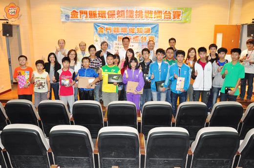 為增加金門地區學生及社會人士對環境保護的正確知識,昨日於金門大學舉辦一場「金門縣一○一年環保知識挑戰擂台賽」,活動吸引近四百位民眾及學生報名參與。賽後,共有董仲凱等二十位挑戰者勝出,他們將代表金門赴台參加全國挑戰賽,爭取殊榮。 主辦單位指出,辦理比賽之目的,是為增加民眾對環保的知識,期望透過活潑、有趣的競賽活動,將環境教育落實於日常生活中,以競賽來引導學習,提升學生及社會人士對環境的覺察與行動能力。 這項有趣的環保挑戰賽,主辦單位為金門縣政府環境保護局,由金湖國中承辦,金門大學、台灣師大協辦。於昨日上午九時起至下午五時三十分,假金門大學理工學院一樓視聽室展開。 這項比賽分為社會、高中職、國中、國小等四組,共有近四百人報名挑戰。環保局長楊世宏、金湖國中校長吳啟騰、教育局課長徐國成等人也特地到場為參賽者加油打氣。 比賽於上午九時起展開,主辦單位為每個組別準備有百餘題環保知識題。各組的參賽者在經過「初賽」、「複賽」,同分者甚至進入「PK賽」後,每組各選出前五名。值得一提的是,高中組冠軍董仲凱,已是連兩年冠軍,同時也是去年國中組全國冠軍。勝出者並獲頒獎狀一面,以及手錶、腳踏車、數位相機、筆記型電腦、平板電腦等精美禮品。而得獎者也將代表金門參加十二月於台北舉行的全國環保挑戰賽。 環保知識挑戰擂台賽獲獎人名單如後: 社會組:冠軍林佳芸、亞軍鄭美良、季軍謝菱琦、優勝曾意評、翁鼎嘉。 高中組:冠軍董仲凱、亞軍成欣玫、季軍周俊傑、優勝許惠棠、陳祐。 國中組:冠軍盛意翔、亞軍林瑋庭、季軍楊鈞皓、優勝許家祥、黃聖翔。 國小組:冠軍洪俊杰、亞軍張朕禓、季軍張宗盛、優勝李彥廷、王照松。