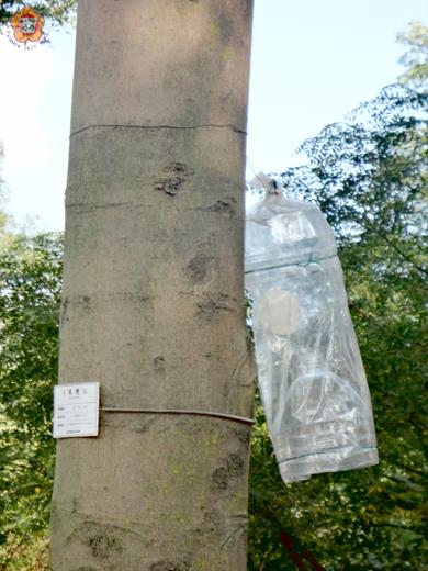 翁碧蓮/圖文 伯玉路兩旁的小葉欖仁樹上,高高懸掛著保特瓶,不要誤以為是裝飾用,事實上,那是林務所防治黑角舞蛾的侵襲,係利用瓶內費洛蒙,引誘雄蟲入瓶交配,成功地誘到雄蟲或是擾亂雌雄的求偶過程,達到防治效果。 黑角舞蛾會對環境造成嚴重破壞,而且還會影響林木生長及整體景觀、干擾人類活動、鱗毛使人過敏、威脅人類健康和安全等的問題。因此,林務所掌握黑角舞蛾的生活習性和族群動態並做好蟲害管理的工作。 林務所對林木維護不遺餘力,對蟲害防治有一套。目前伯玉路每株樹木都擁有身分證號碼及懸掛樹牌說明,以增加縣民及孩童對生態資源認識,林務所也期望大家共同愛護林木,守護綠色家園。