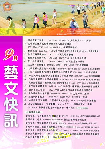 夏末初秋,桂花飄香的季節!金門縣文化局九月份藝文活動有音樂、書畫、絲竹、陶藝,以及文學地圖心靈座談,總共有十餘項之多,內容多樣及十分豐富。其中,藝起來福Easy Life~2012年校園巡演、文化園區歷史民俗博物館專業人員培訓講座將於九月一日率先登場,揭開文化局九月份藝文饗宴序幕。 金門文化局九月份藝文活動除了目前在第一、二展場展出的兩岸書畫交流展外,自今(一)日起至九月三十日有下列各項藝文內容: 文化園區歷史民俗博物館專業人員培訓講座,九月一日上午十時至下午五時十分;九月二日上午八時十分至下午五時三十分,均假文化園區視聽室舉辦。 藝起來福Easy Life~2012年校園巡迴演出推廣活動,九月一日下午七時三十分,在文化局演藝廳舉辦。 徐元妤鋼琴獨奏會,九月七日下午七時三十分,在文化局演藝廳舉行。 楊佳廣蛋彩創作展,九月八日至九月廿五日的每日上午八時至下午五時三十分,在文化局第二展場展出。 行之舞之書法展,九月八日至九月廿五日上午八時至下午五時三十分,在文化局第一展場舉辦。 momo台「親親寶貝 愛你呦」活動,九月八日下午一時三十分,假文化局演藝廳舉辦。 文學地圖心靈座談~劉德輔:全新的我們,全心的金門,九月十一日下午六時三十分,假文化局三樓會議室舉辦。 小巨人絲竹樂團/如果兒童劇團:小虎歷險記,九月十四日上午十一時、九月十五日上午九時、九月十五日上午十時,均假文化局演藝廳演出。 九歌兒童劇團:闔家歡劇場《判官審石頭》,九月廿一日及廿二日下午七時三十分,在文化局演藝廳演出。 九歌兒童劇團:生活故事劇場《吉兒與小凱》,九月廿二日下午二時三十分,假文化局北棟圖書館五樓舞蹈教室演出。 金門申遺國際座談,九月廿二日上午八時三十分至下午五時,假金門大學圖資大樓B1陳開蓉演講廳舉辦。 金門申遺工作坊,九月廿三日上午九時至下午五時,假金門大學建築學系階梯教室舉辦。 退休教師學會會員展,九月廿八日至十月十日的每天上午八時至下午五時三十分,假文化局第二展場展出。 王明宗陶藝個展,九月廿八日至十月十七日的每天上午八時至下午五時三十分,假文化局第一展場亮相。 吉他印象室內樂團:「環遊世界八十分」,九月廿八日下午七時三十分,假文化局演藝廳演出。 另外,文化局社區營造活動有:黃厝社區公共藝術創作-聞雞起舞九月一日至十日每天上午九時至下午六時,於烈嶼鄉黃厝村公園舉辦。黃厝社區造窯,九月十一日至廿日每日上午九時至下午六時,假烈嶼鄉黃厝村公園舉辦。黃厝社區燒窯暨窯烤美食活動,九月廿八日至卅日每天上午九時至下午六時,烈嶼鄉黃厝村公園舉辦。富康一村社區民族舞蹈工作坊,九月二日至卅日(每周五、日)下午七時至十時,假金門縣體育館舞蹈教室舉辦。榮光社區腰鼓舞工作坊,九月一日至廿九日(每周六、二) 下午七時至十時,金沙鎮複合式運動場舉辦。東沙文史發表會,九月八日上午九時至十二時,在金城閩王祠東護龍二樓會議室舉辦。社區影像及電影院九月五日下午七時,在新市社區舉辦。