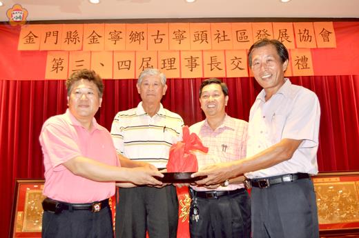 金寧鄉古寧社區發展協會日昨假昔果山海鱻城餐廳舉行第四屆理監事交接,理事長李正騰功成身退,由李開陣接棒。金寧鄉代表會並致贈「克孚眾望」大紅匾額祝賀,李開陣接任後表示,今後除了更加竭盡心力為社區服務外,更希望有更多的社區民眾參與發展協會所舉辦的活動,基於用於鄉里、回饋鄉里的心,將為古寧社區爭取更多的福利,讓社區的發展更加蓬勃。 金寧鄉古寧社區發展協會日昨假昔果山海鱻城餐廳舉行第四屆理監事交接典禮,在金寧鄉長陳成勇與常務監事李朝金監證下,卸任理事長李正騰將印信交接給新任理事長李開陣,同時在理監事的熱烈掌聲與祝福中,正式完成交接儀式。縣府社會局課長李文堆代表縣府頒發理事長證書給予李開陣,現場並由理事長李開陣頒發當選證書給第四屆理監事成員,立委楊應雄、民政局局長翁伸金、議員李誠智、許華玉、金門國家公園管理處副處長盧淑妃、秘書蘇承基、西區主任許丕祥、金寧鄉長陳成勇、金湖鎮長蔡西湖、金寧鄉代表會主席楊萬山、金沙鎮代會主席王秀玉、烈嶼鄉代會主席洪若珊、金寧鄉代表陳成泉、李正騰、辛愛華及公所各課長、村長與李氏宗親等人出席觀禮。 金寧鄉代表會全體人員並致贈「克孚眾望」大紅匾額,祝賀副主席李開陣榮膺社區理事長,新任理事長也致贈紀念牌感謝卸任理事長李正騰、總幹事李世瑤為社區業務付出的辛勞。 立委楊應雄表示,古寧頭社區面積很廣大包含北山、南山、林厝與慈湖農莊,是古寧頭觀光重鎮,但是因位於金門國家公園管轄範圍內,幅地上和金管處有些重疊,未來還盼望金管處多多協助,在這樣大社區土地中,會有許多鄉親想回來開發建設,但是金管處限制較多,雖然經第三次通盤檢討後有局部釋放,但還是無法滿足古寧社區鄉親發展需求,希望盧副處長能多努力讓社區發展空間能更大,相信整個社區也會配合國家公園的建設,共同營造出漂亮的家園,讓觀光客列入一定要參觀的景點,這才是雙贏。 古寧社區發展協會第四屆理監事名單如后:理事長:李開陣。常務理事:李金鎗、李世瑤、李錫添、李添財。理事分別為:李錫銘、李坤州、李浩瑋、李清土、李金溝、董明城、莊素月、李勝錦、李成在、李錫明。常務監事:李朝金;監事:李俊龍、莊養財、李俊彥、李振銘。總幹事:李琳榔。副總幹事:李天送。