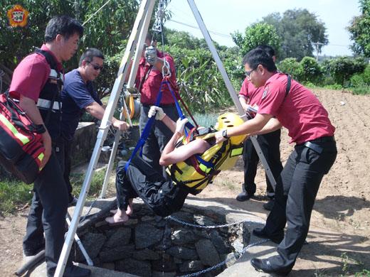 烈嶼消防分隊辦理一場低所救助演練,現場為模擬民眾不慎跌入井,警義消合力救人,整個演練過程詳實逼真。 烈嶼消防分隊為加強所屬人員災時緊急應變能力,提昇災害搶救技能,以西吳村內的水井,進行侷限空間低所救助搶救演練活動,模擬民眾不慎跌入井,由一旁民眾向119勤務指揮中心報案求救,烈嶼分隊獲報後出動消防車、救助車及救護車,人員共計12名,抵達現場後,經指揮官研判:「因墜落處係屬密閉垂直空間,且救助器材車無法靠近使用吊臂,須以架設立坑三角架方式救,一員先以立坑三腳架鋼索滑輪下降至傷患旁進行初步生命徵象評估並予以必要之急救措施,另一員利用繩索固定傷患,俾利將病患吊掛上來送醫急救,整個演練過程詳實逼真,猶如真實救災現場一般。 消防局長楊肅凱表示,訓練是為利於同仁因應瞬息萬變災害現場,經由這一次低所救助訓練過程,讓警義消熟練繩索使用暨應用之相關安全注意事項,未來會持續執行各項救災救護訓練,以落實維護地區民眾生命財產安全之重責。
